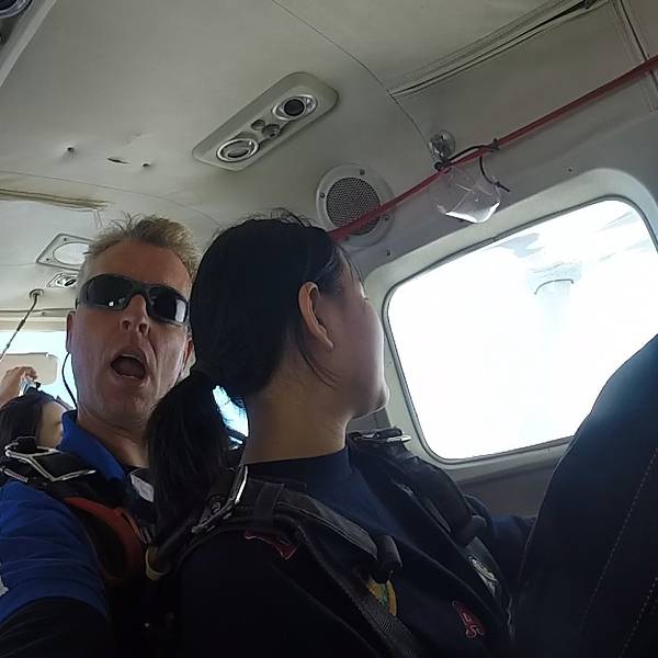 和我一起跳伞的教练是一个有些古怪的小老头。虽然他已经满头的白发,但精神还是十分的好,喜欢对着镜头做鬼脸。教练们并不死板,有一位日本教练半神秘半开玩笑的对我说 “你的教练玩的可疯狂了!上次和他一起跳伞的女孩,我只在上飞机前见过她一次,然后连她的影子都没见过了。。。”其他人也都配合着做出一本正经的样子。同行的华人那么多,这帮教练偏偏还就拿我开刷了,想是要吓吓我这位小姑娘。哼,想吓唬我,没门儿。我定了定神,微笑着说 “我相信我的教练。”