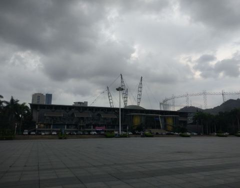 老体育中心,体育中心2公交站下车就到了,大门进去是开阔的广场,广场上有几个运动雕塑还不错,主场馆在大门正对面广场尽头,比较旧,周边是小区楼房,可看到几栋地标建筑。