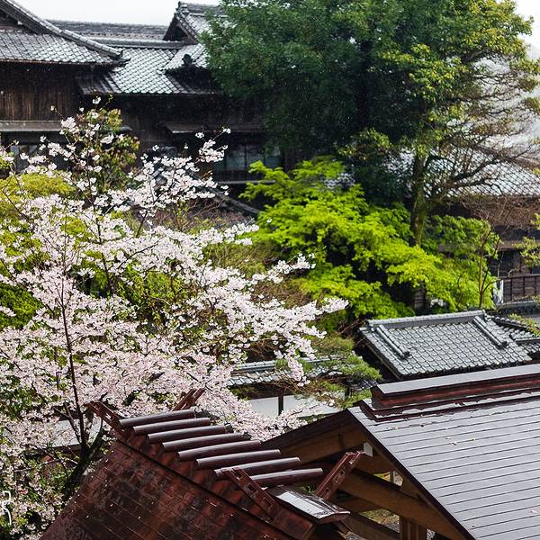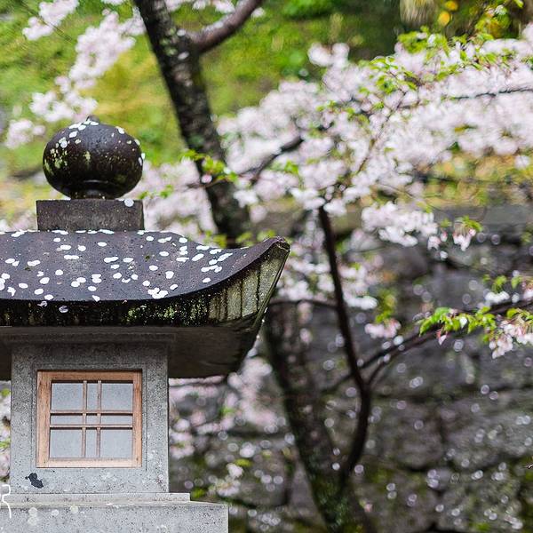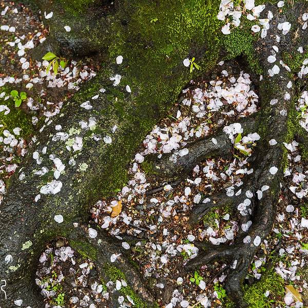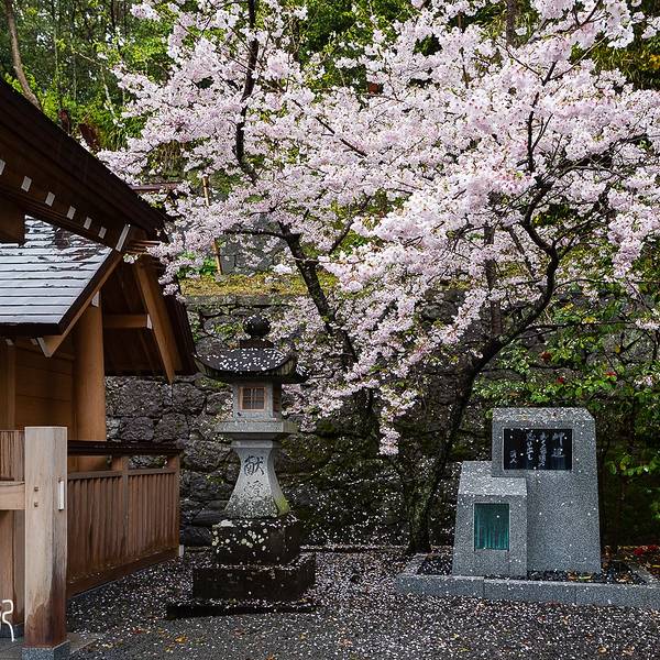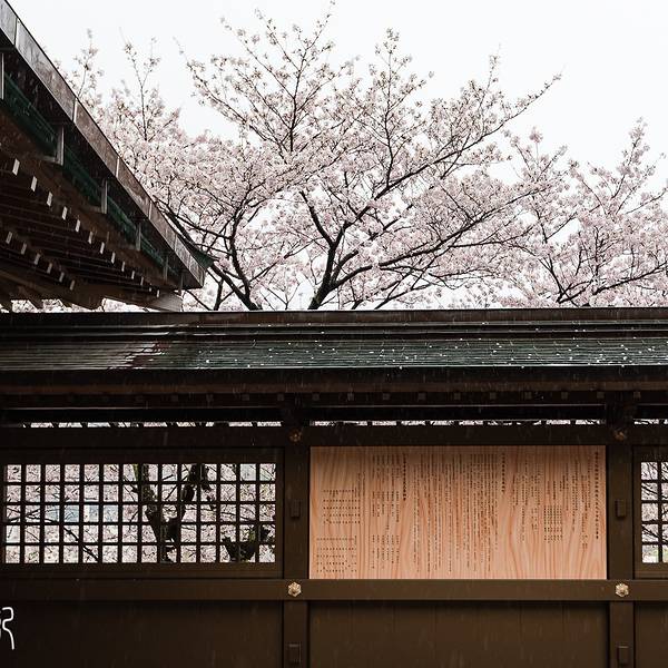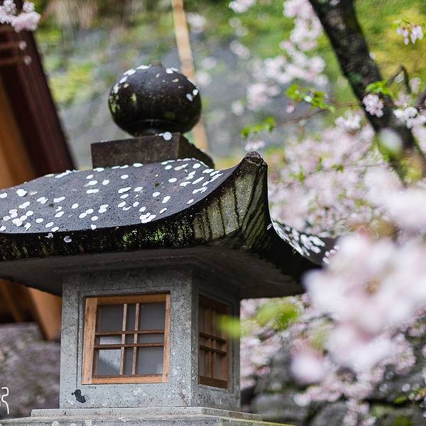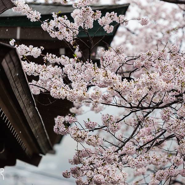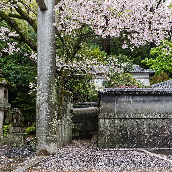 还未走到神社大门,便被边上的樱花吸引。雨中,樱花落了一地。依旧在树上绽放的,还在承受着风吹雨打,坚持着最后的盛开。