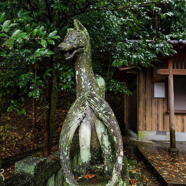 神社的大殿,并没有一一的走进,既然没有参拜的意思,那便不去打扰。只是漫步在狛犬散步道上,看一个个不同形态、不同名字、守护着不同神明、承载着不同功能的狛犬,有可以帮你戒掉不好习惯的、有守护钱财的。雨中,长满了青苔的狛犬,格外的精神。