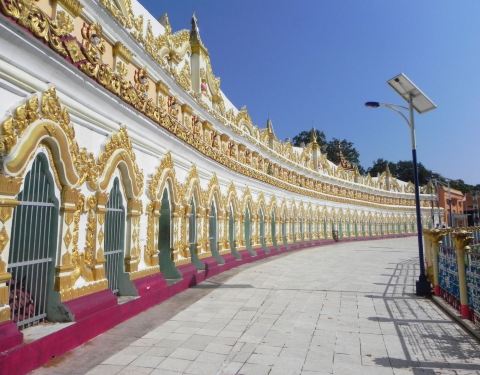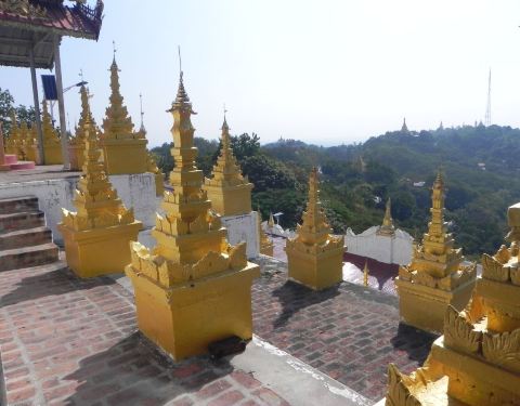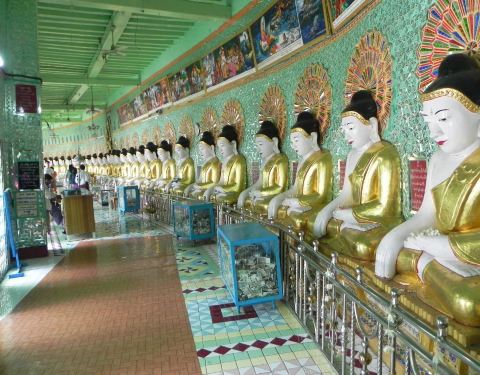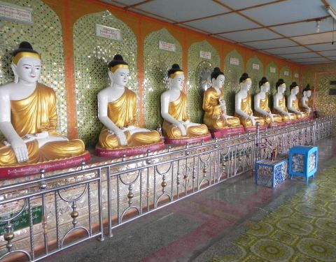 在实皆山上,这个寺庙是重建的,结构很具特色,弧形,一溜儿排开四十多个完全一致的佛像,这是在缅甸其它地方没见过的。外面可以远眺伊洛瓦底江。