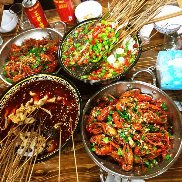 4月12日吃货钵钵鸡(南湖店)隆重开业,作为一名好吃嘴当然是第一批去品尝美食的啦。12日与当地电台FM90.8盐都好吃嘴栏目一行8人晚上九点前往吃货钵钵鸡(南湖店)品尝美食。这家店位置非常优越,坐落于南湖华商国际城的海鲜一条街,靠近格林东方酒店附近。分为店内布局和露天布局。总体面积约40m2,能放下7张桌子。店外露天能放下6张桌子。装饰环境简单干净。全采用木制桌子。两个大冰柜放着钵钵鸡菜品,荤菜有鸭肠、鸭舌、毛肚、火腿肠、丸子等等。蔬菜有黄瓜、豆皮、土豆片、藕片、香菇、海带、有机花菜、海白菜等等。调料分为藤椒味和麻辣味两种。藤椒味清爽新鲜,不管从颜色和味道来说都很有食欲,但是一口两口三口下去绝对是挑战你的味蕾啊。麻辣味自然是红油与辣椒相伴。麻辣口感和小米辣椒的搭配加上一点芝麻。爽爽爽。这家店其实就是理工学院吃货钵钵鸡的分店,但是这家店可以提供晚餐和宵夜,在理工学院只能有宵夜。我推荐钵钵鸡的是鸭肠,特别的脆,火候刚刚好。也很入味。另外这家店还有特色就是麻辣小龙虾,我们一共8人点了2份钵钵鸡藤椒味和麻辣味各一份。小龙虾2份,麻辣味和五香味。个头都很不错,一口下去咬龙虾尾部连壳都不需要拨,直接补钙了。老板也是非常热情的人。有任何的需要都可以提出来。店内伙计也很勤快好客。在四川的特点就是美食色香味俱全,道客方面人情味十足。这家店真的很不错,强烈推荐。温馨提示:1:可以乘坐37路华商国际城线、303路在华商国际城下车。步行100米到海鲜一条街找到吃货钵钵鸡。2:钵钵鸡荤菜1元、素材5毛。配料免费,麻辣小龙虾56元一份,分量十足。3:店内有豆奶、加多宝等饮料可以点。还有啤酒,新开业的店优惠很多。4:店铺营业时间晚上5点-凌晨2点。5:在这家店吃饭报FM908会有优惠的哦!!!推荐指数:5星。满满的!!!