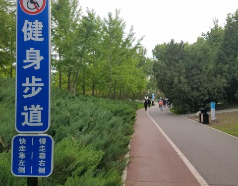 四得公园虽小,但西临机场高速,南靠坝河,可谓是闹市里的宝藏地了,主打“体育休闲娱乐”,这里有很多的足球网球场地,也修了健身步道,走一圈下来是0.9km,还贴心的标好了起止点。