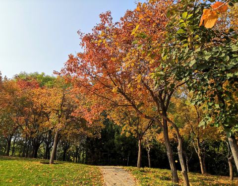公园不算大,不过里面绿化的不错,树木和花草都比较多。秋天的景色也很不错,都是斑斓的色彩