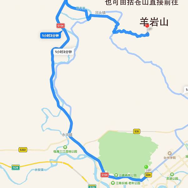 临海市区启程----沿104国道往天台方向经留贤、赤庙等村(车程30分钟左右)--河头镇--沿大青线经河头村、中罗村、前山一村、前山二村直达羊岩山门--羊岩茶场