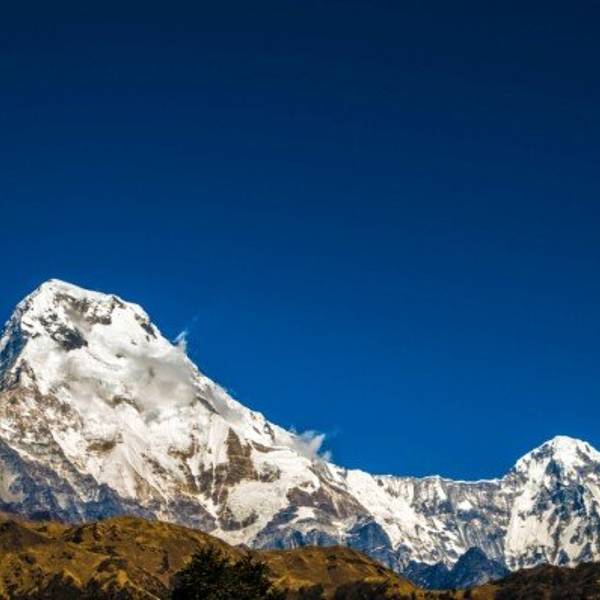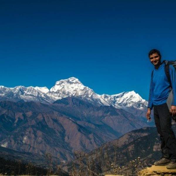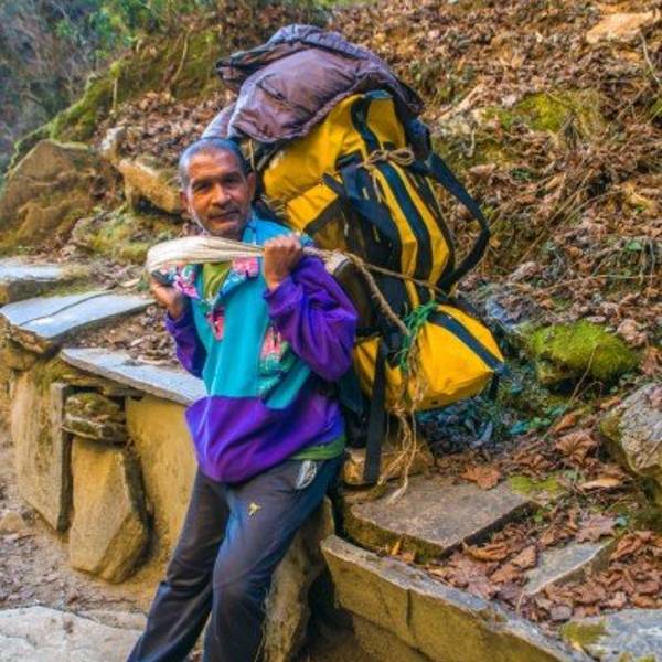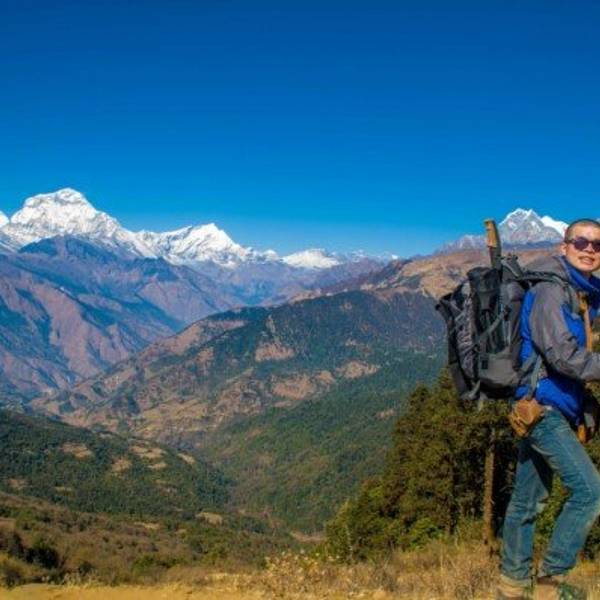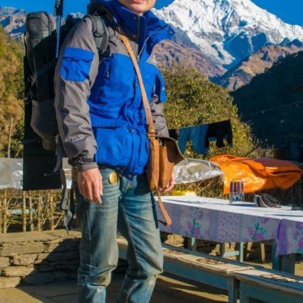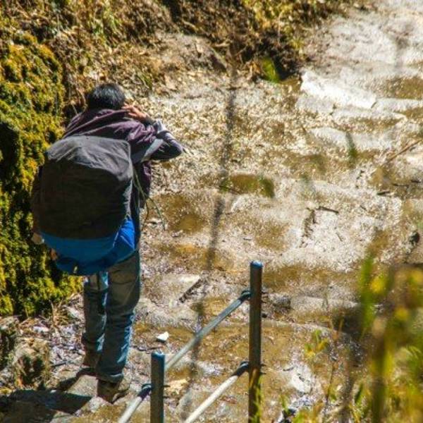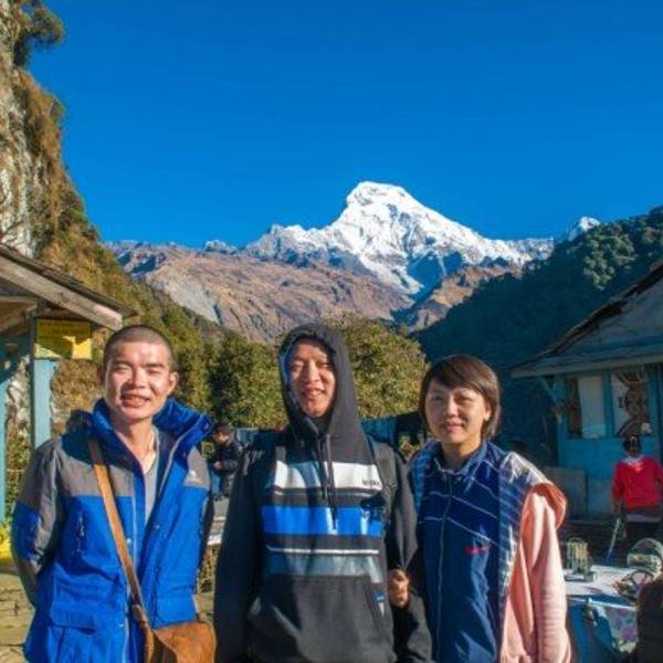 今天只需走个三小时,便不急不慢,经过峡谷,小河淌水,寒冰三尺,一次次勾起了拍照的欲望,什么无聊,什么辛苦全然消失,尽管一路上坡,但半随着雪山也无压力。直到上到上顶,一面雪山,一面群山尽在脚下,可惜,无人来给我拍照,多么浪费,终于等到有人来了,一个看起来凶巴巴的背夫,放了行李就抽烟,不敢冒昧,正准备下山,发现一个角度,一个面对雪山的梯子,真不想浪费这般好角度,大胆对他说:"EXcuse me, can you help me take a Photo?"