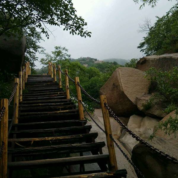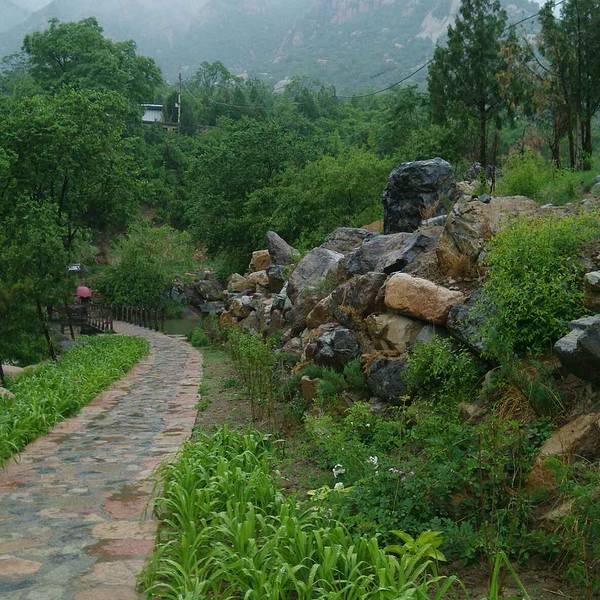 周末,虽是下雨,但丝毫没有影响我们的游兴,仍旧自驾去了白虎涧森林公园。公园的面积很大,可以用山高林密来形容。有山有水,道路修整得很好,非常适合步行。各位看官,且随我行来。进入森林公园的大门,左边就是水库区,水库面积不是很大,几个水潭呈阶梯状连在一起,景色优美,感觉非常凉爽,舒适宜人。沿着鹅卵石铺就的小道前行,下雨,一点也不滑,反而因雨水的冲洗,满眼碧色,很是赏心悦目,神清气爽。公园里有不少的野生果树,樱桃,核桃,桑椹,梨树等,我想着果实成熟的时候漫山遍野也一定很美。流口水有木有?山道很好走,时而步行在鹅卵石上,时而沿石板台阶拾阶而上,在碧绿的山间穿行,一步一景,很是享受。不知不觉走了一个多小时,山路还没有尽头,担心下暴雨,于是我们就回返,路上看到一驴友穿的像冲锋衣式的衣服,居然在大雨中健步如飞,我也是醉了,赶明也整上这么一件,可好?游玩了两个多小时,感觉真的很棒,我想如果不是下雨的话,在里面呆上一天,呼吸这样清新的空气,远离城市的喧嚣和雾霾是很享受的。因用的是年票,直接刷卡就进去了,如果没有年票的话,建议网上订票,有优惠。森林公园里有一农家院可提供餐饮。不过,我们没吃,直接开车去了离此大概5公里左右的西小营金百万,它家的炒菜味道不错。