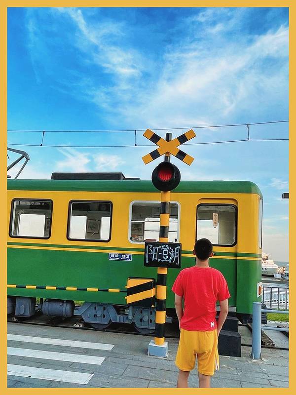 🌊阳光映照在湖水泛起粼粼波光,蓝天做衬一幅绝美画作,加上绿皮火车高饱和度色调搭配橙黄线条勾勒,拍照效果真的绝了。加上轨道、电线、红绿灯🚦,还原度超高,出片率就有点离谱。