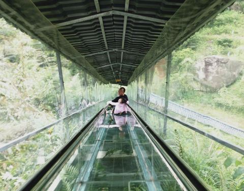 酒足饭饱后,我们就正式开始今天份打卡项目:鼓鸣岩景区的玻璃天桥,传说中是厦漳泉唯一一座10D的全透明玻璃天桥,带上鞋套,走上去的确很刺激,大概有30层楼那么高,可以很仔细的看到下面的峡谷,走到中间的地方还有点轻微晃动,快结束的地方,竟然有玻璃炸裂的高科技,吓到随行的小伙伴了……玻璃滑道就在天桥结束的地方,可以穿上景区准备的滑道裤,从山上可以一口气滑到峡谷,也可以用脚控制速度。玩:采摘当地应季水果