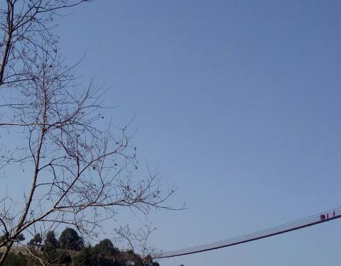 白鹤山庄里有一条全长358米,高48米的中国第一悬空铁索桥,我是一个完全不恐高的人,可是走在这条桥的后半部分,居然也会有点提心吊胆的感觉,因为它真的太长了,站在离岸200米的地方,前不着村后不着店,往下看是完全悬空的十几层楼的高度,透过铁丝网,桥下的水面清晰可见,每一步都感觉是踏在空气上,走完一圈,还真有点后怕。