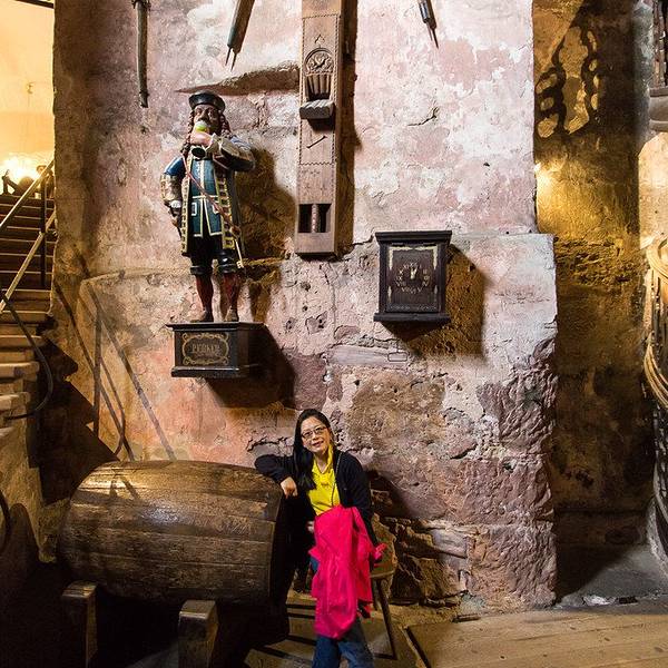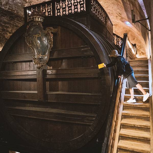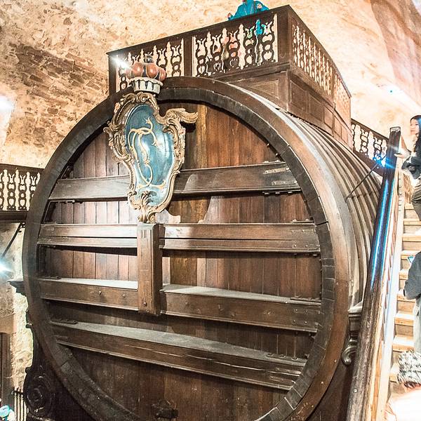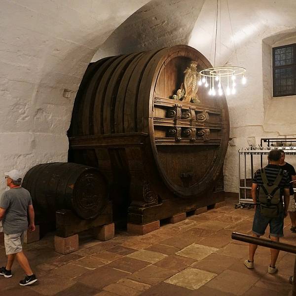 城堡的地库中保存着全德国最大的葡萄酒酒桶。整个酒桶直径大约有三层楼高,深度大约为10米,据说至今里面还存有葡萄酒。酒桶背后还有一个小故事。传说以前看管这个大酒桶的是一个叫做Perkeo的仆人,他是真正的千杯不倒。职务之便,他平日以酒代水。但是为了他的健康着想,大家都劝他多喝水。没想到的是,perkeo却在改饮下一杯水之后暴毙。城堡的堡主于是刻了一个他的木雕像挂在酒桶上,并封他为酒神。