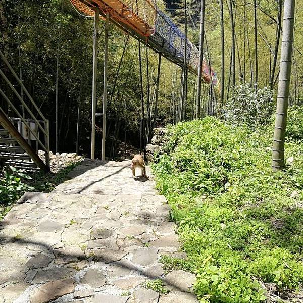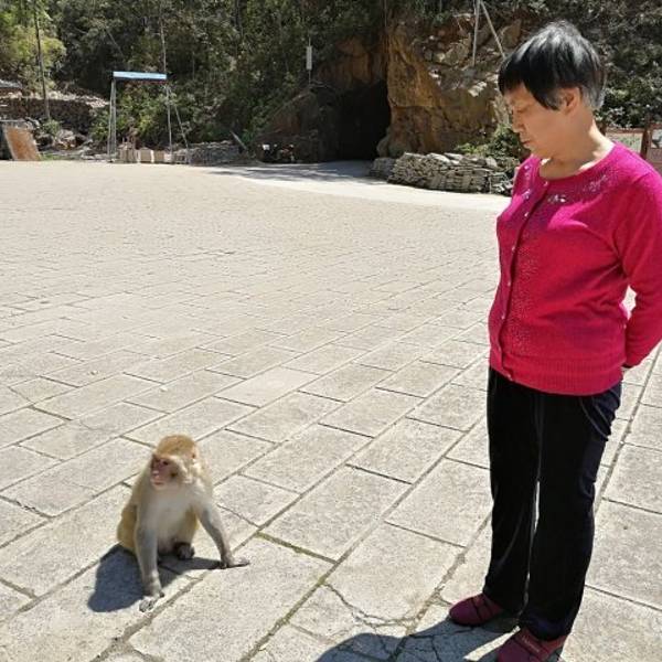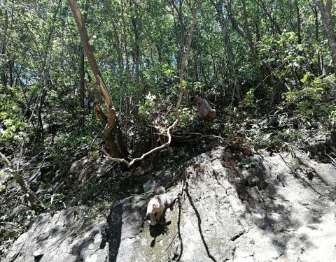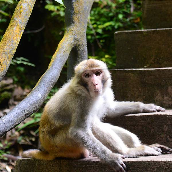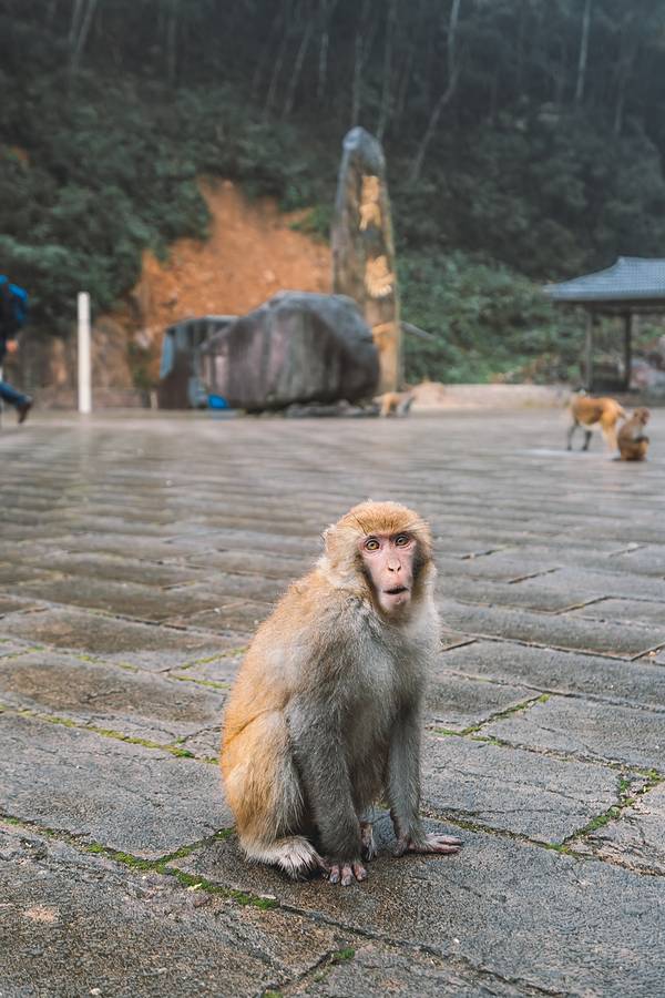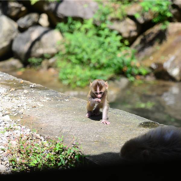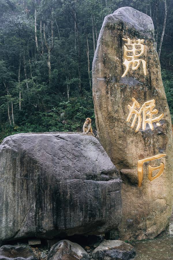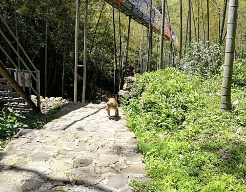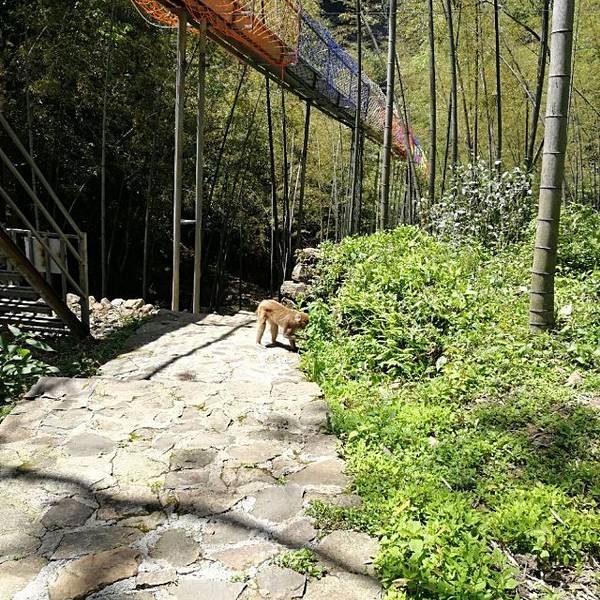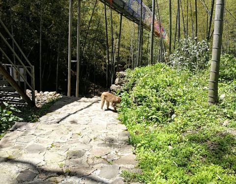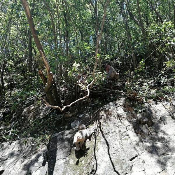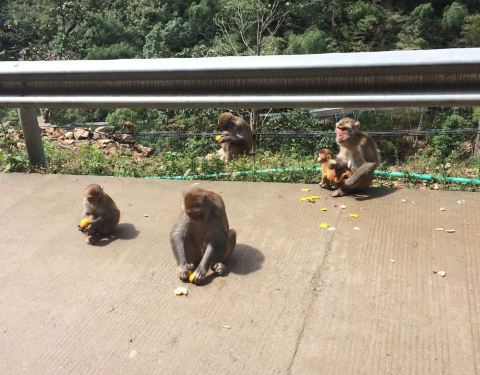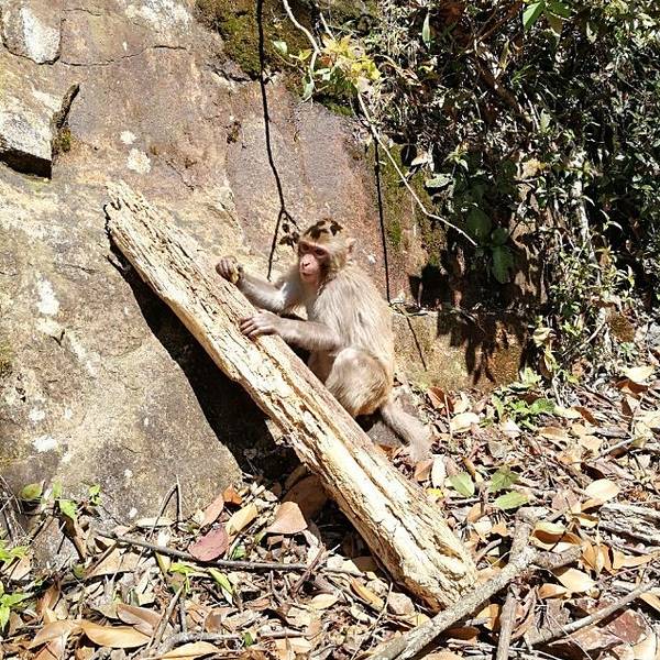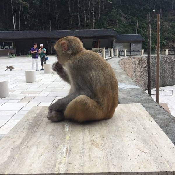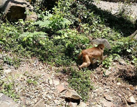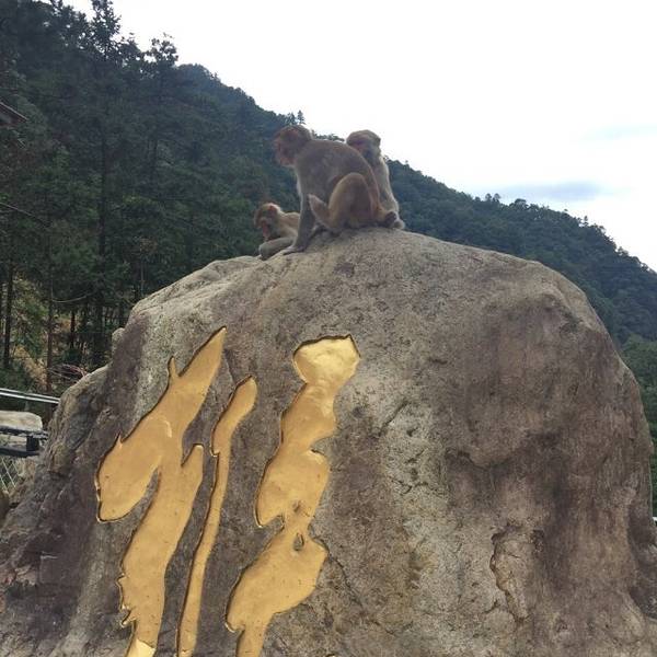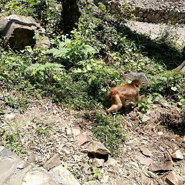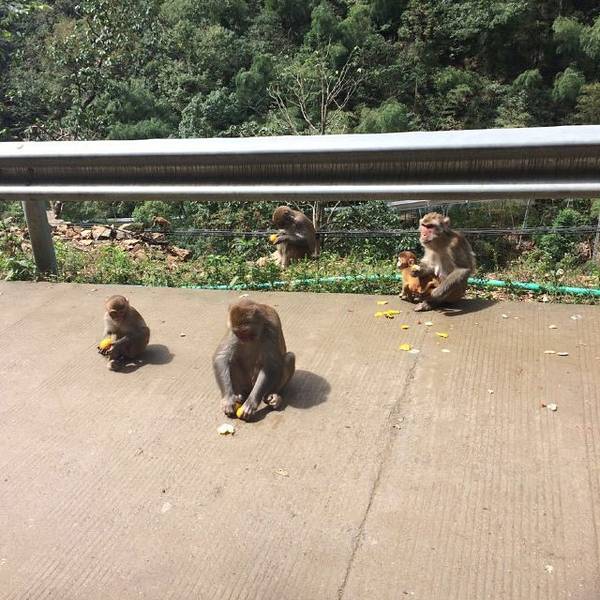 山中最多的是短尾猴,整个谷里有200多只,它们机敏顽皮,与人和平相处,完全不会像峨眉山的猴子那样强取豪夺人类的物品,也不会掀女生的裙子。它们在林中奔跑跳跃时,森林翻滚起伏,犹如狂风刮过海面,绿波起伏。有一只猴子竟然尾随我们走了很远的路,我们停下来,它就停在我们旁边左瞧瞧又看看,我们走它就会跟上来。不过在快要到达万猴广场的时候那只猴子消失了,不知道是不是它惧怕这里的“猴王“