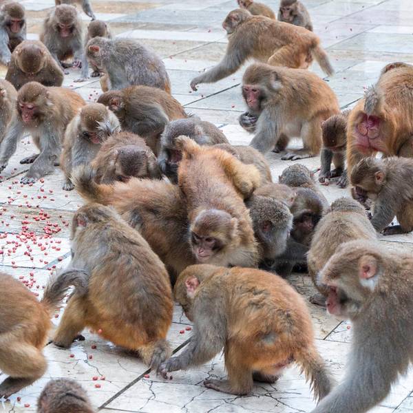 刚到万猴广场的时候猴子并不是很多,但是当饲养员的哨子一响起来,他们就会从四面八方聚拢而来,围在饲养员旁边等着他桶的好吃的。