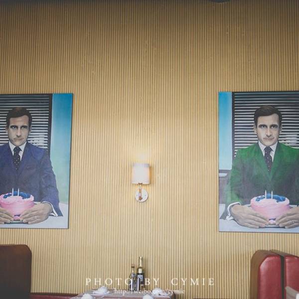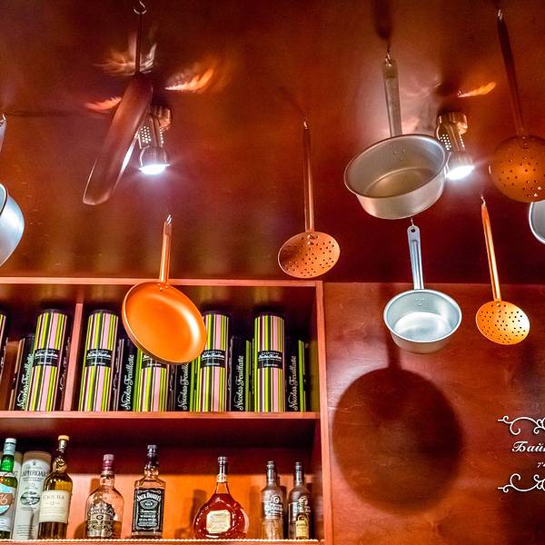 他家的吧台布置很有趣,天花板上挂满了厨具