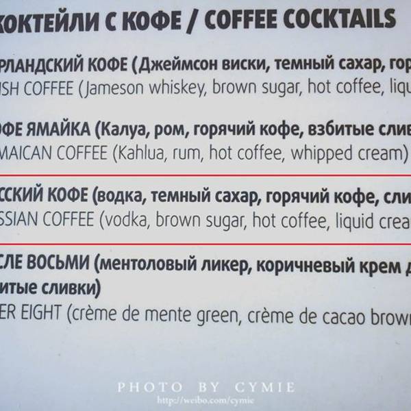 接待我们的服务生是长着东亚面孔的帅哥,真的很帅,讲一口流利的英文。看到这个也是醉了,加了伏特加的Russian coffee可还行。