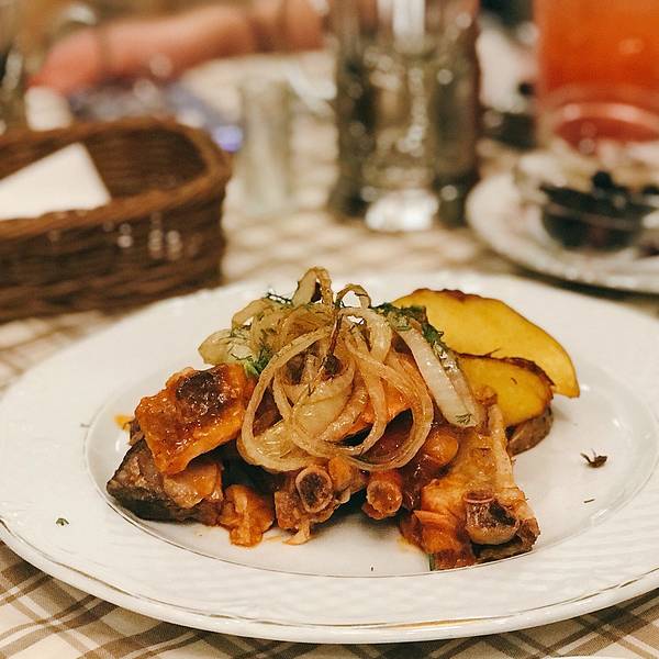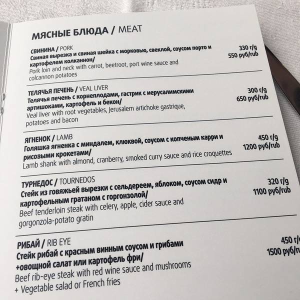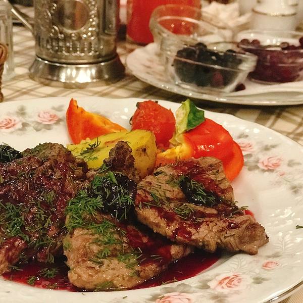 推荐大虾沙拉,超大一份,好吃不贵海鲜汤,料很足,味道不错。说一下这里有名的红菜汤我们来的第一晚就吃了,感觉并没有什么特别,所以后面就没有再点Pear tart味道很不错,强烈推荐。香草冰淇淋球、焦糖、热梨子片,最好吃的一道甜品这份牛排有点坑,点餐的时候服务员就一直跟我们讲没有点主食,她推荐了牛排,也没有让我们选择,直接帮我们点了一份超级贵的牛排!最后结账的时候,竟然吃了4300卢布