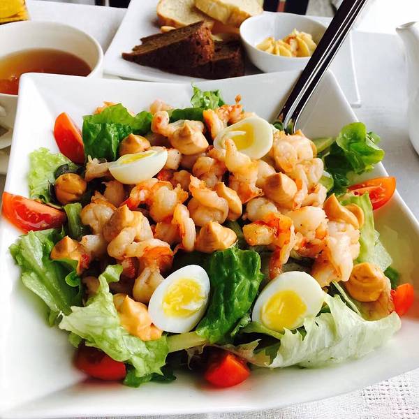- 推荐大虾沙拉,超大一份,好吃不贵。香草冰淇淋球、焦糖、热梨子片,最好吃的一道甜品