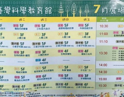 为了带小孩来这里,特意再到士林区。来之前己打过电话咨询,职员己经说清楚乘车路线,但从捷运红线士林站出来还是没找到巴士站,早上天气也热,只好搭计程车前往,大概是一公里左右,也很近,车上听司机介绍科学馆旁边还有一个天文馆。门票是成人一百台币,小孩七十,可以刷悠游卡,参观完了,你就会觉得值回票价。首先馆内的电梯和扶手电梯都是釆取透明设计,让小朋友可以看看机器运行的情况,有心思吧?!从八楼往下参观,仿生展,数学馆,3D恐龙馆等,负层有3D电影厅,提示一下有部分展馆需要另外购票。感觉无论从展览水平和设施配套,都比国内水平要高。到了午饭时间,选择在负层的美食广场用餐。下午有空余时间,出馆后选择坐计程车到士林官邸,参观完后从官邸的花园出来,过马路大概五六百米就可以回到士林站坐捷运。补充一下士林官邸的正馆周一是闭馆的,花园则一周开放。