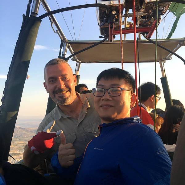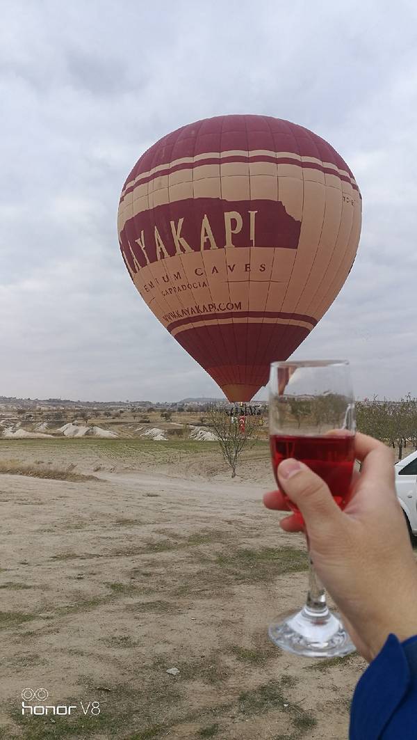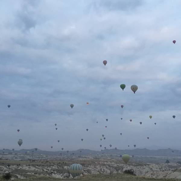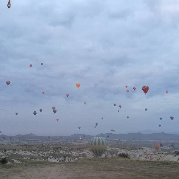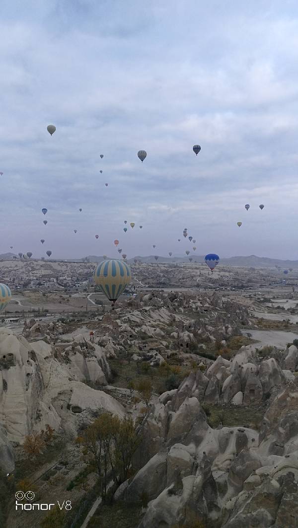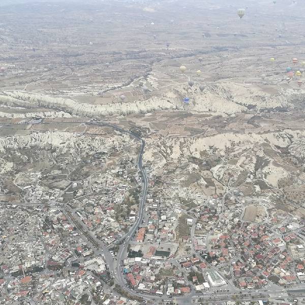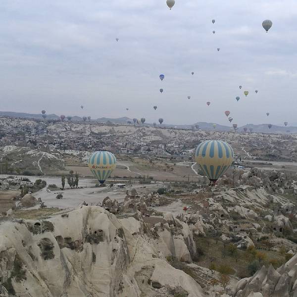 我们坐的是二十人的大热气球,驾驶室在中间,周围是四个篮子,每个篮子里5个人。可以任意走动,相互拍照,飞的很稳,不用担心不安全。飞了好像是半小时到1小时,会飞到最高的位置,也会飞的很低穿越那些沟沟壑壑,很有意思。在热气球上就是一通狂拍,拍朝阳初升的天空,拍满天的各式各样的热气球,拍高空俯瞰下的卡帕多奇亚奇特的地貌。手机像素很一般,我觉得即使单反拍也拍不出实际看到的景色,非常壮观。