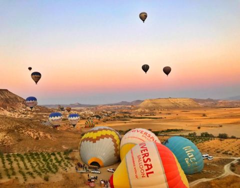 卡帕多奇亚热气球体验可谓是来到卡帕多奇亚必做的一件事。 卡帕多奇亚由于火山喷发后形成的熔岩,在自然风蚀后形成的千奇百怪的地形,山谷的衍生,山脉的褶皱,弯曲的河流,散落的集镇,一切尽在鸟瞰中。这里曾被美国《国家地理》杂志社评选为十大地球美景之一,其地貌酷似月球表面,《星球大战》的外景拍摄地就是这里。 清晨热气球数量众多,各种颜色的巨型气球漫天飞舞,就如童话世界一般奇妙。如果你没有机会乘坐热气球,但是又正巧住在这些放飞地点的旁边,那你可以趁早起来拍一些照片,几乎每一张都可以充当明信片。 卡帕多西亚的飞行条件相当不错,每年的4月-10月的大多数清晨都能飞行。等待着热气球升起的那一刻,当旭日冉冉渲染了这片黄土之后,脚下这片壮观神奇的景色越来越美艳动人。随着高度的攀升,一边是耀眼的日出,群山和晨雾,另一边是峡谷,洞穴和一大群五颜六色的热气球。置身于高空,在日出柔和的阳光下俯瞰拥有神奇月球地貌的卡帕多奇亚,为大自然的鬼斧神工而惊叹。 由于热气球是靠风力飞行的,因此无法保证某一天的具体飞行路线。游客需要带着地图,不然在上空都不知道地面是哪了。经验老道的飞行员控制着方向和飞行高度,忽高忽低,平稳地穿梭在一个又一个峡谷之中,好像在与岩石烟囱捉迷藏。有的时候热气球会飞得离岩壁很近很近,好像伸手就能触碰到一样。有的时候热气球会飘到高空,在地面上看起来很高的山峦,现在就好像石子路一样,层层起伏,令人心潮澎湃。 飞行过程中,飞行员会不停旋转热气球,以便篮子中的每位乘客都能看到四周的风景。降落的时候,飞行员会特别说明一下降落时的注意事项。临近地面,会抛下几根绳子,在地面上的工作人员紧紧拉住这些绳子来控制热气球的方位与高度。在接触地面的瞬间,这些小伙们一扑而上,死死地压在吊篮边缘,让热气球不再飞起。之后会开过来一辆拖车,飞行员再次点火,热气球腾空一点,飞到拖车上再次停稳。这样才算着陆。 着陆后所有的人都要负责一起将热气球折叠起来。之后将会举行一个小型的仪式,热气球公司会开香槟,吃些水果庆祝。每人还会发一张证明书,上面印有你的大名,飞行员的名字和飞行日期,非常有意义。你也可以趁这个时候与飞行员合影留念。