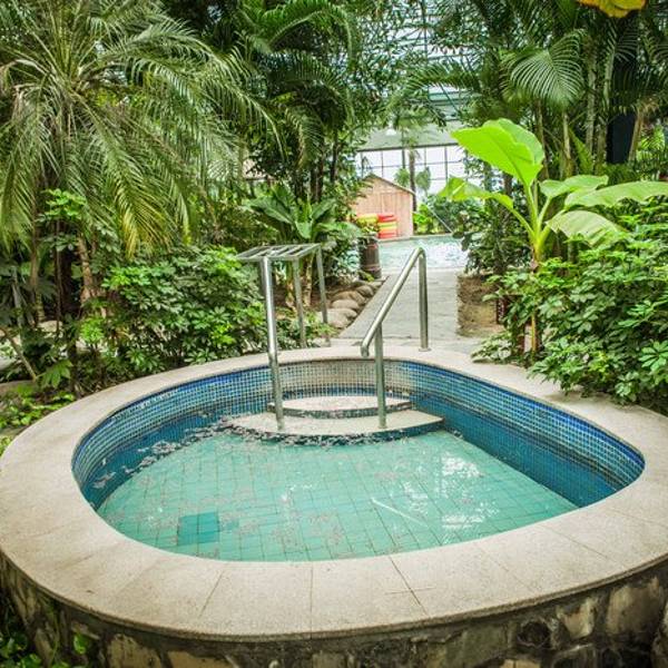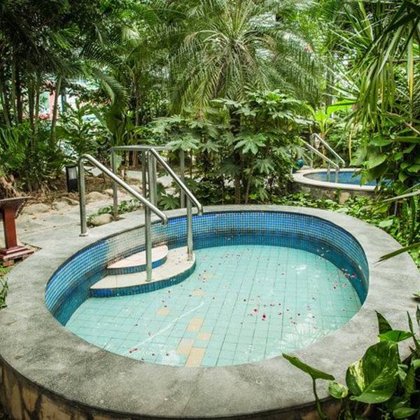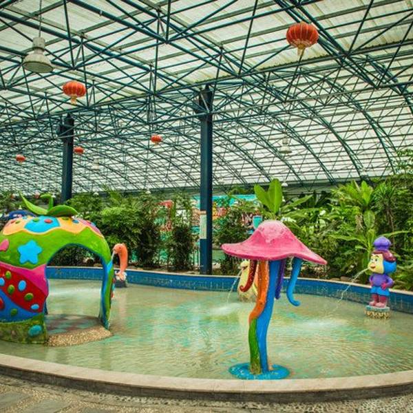 酒店隔壁就是老子山温泉山庄,老子山温泉水温高达61℃,以硫磺泉水为主,富含多种人体必需的微量元素,这里不光有大型泳池和品类各异的水疗、鱼疗、花药浴、泥巴浴,还有供小朋友玩耍的儿童浴池,儿童浴池有几个憨萌可掬的童话雕塑喷头和一个蘑菇形状的小亭,足矣吸引住小朋友,实乃是该温泉山庄的贴心之举,小孩子玩好了,大人才能玩好。 再来提提花药池,不同池里撒满各种新鲜花瓣,有玫瑰菊花和薰衣草等等,女子在此处先泡个泥浴,去掉身体的死皮垃圾,再进入花药池里慢慢浸泡,出浴时保证会花香四溢,甜美袭人。 该温泉有卓越的理疗保健作用,兼备排毒养颜、美白肌肤、调理身心等多重功效,享有苏北热海、泽国仙境、华东首席温泉度假区之美誉。