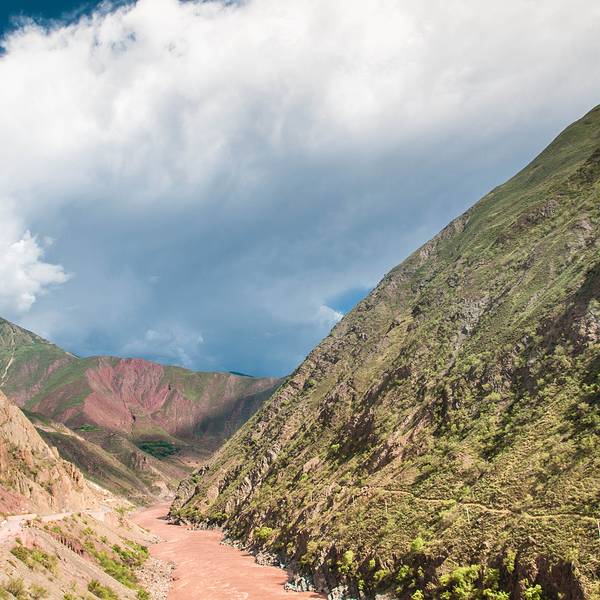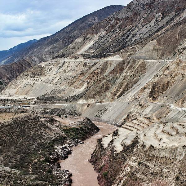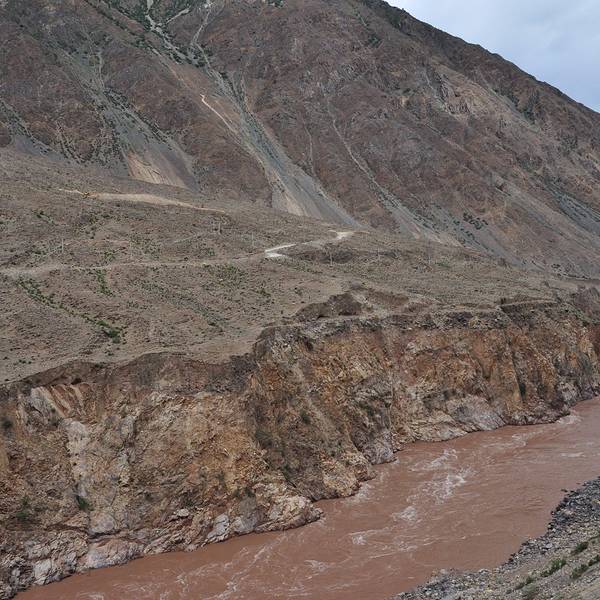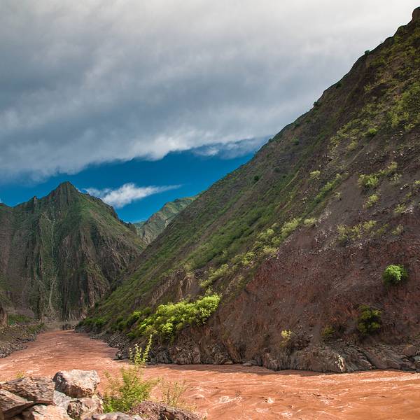 转过弯来,澜沧江出现在眼前。左侧悬崖滑坡,右侧江水碧绿。