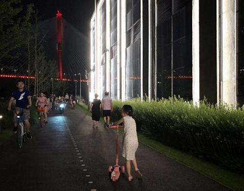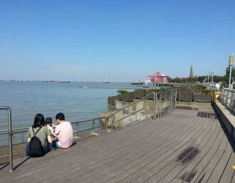 上海黄浦江两岸的滨江健身步道,40多公里像两条蜿蜒的小龙盘旋着。江边还有学习休闲的望江驿