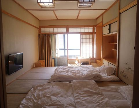 三间日式榻榻米房,孩子办了加床,室内室外都有池子,水质不错,随心情想什么时候就什么时候泡温泉,很舒服