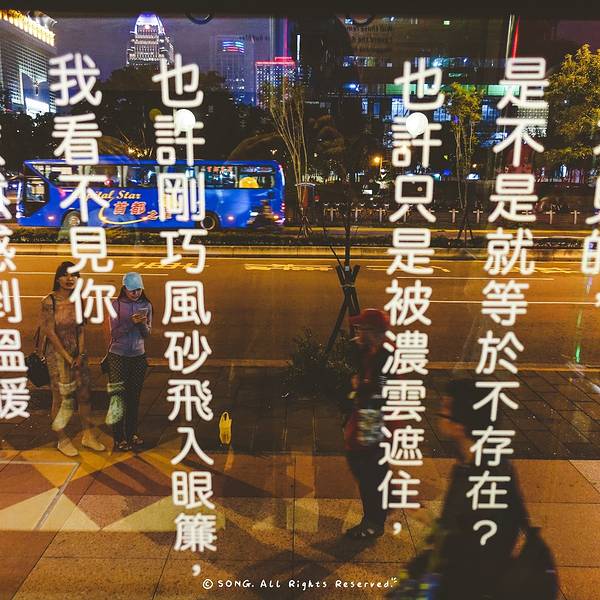 是不是就等於不存在 記 住 的,是不是永遠不會消失 也許什麼都沒發生過,也許一切都已發生 月亮忘記了從“遺忘”開往“記住” 在 遺 忘 里 迷 失,從 遺 忘 里 找 回 看不見的,是不是就等於不存在 記 住 的,是不是永遠不會消失 也許什麼都沒發生過,也許一切都已發生 月亮忘記了