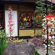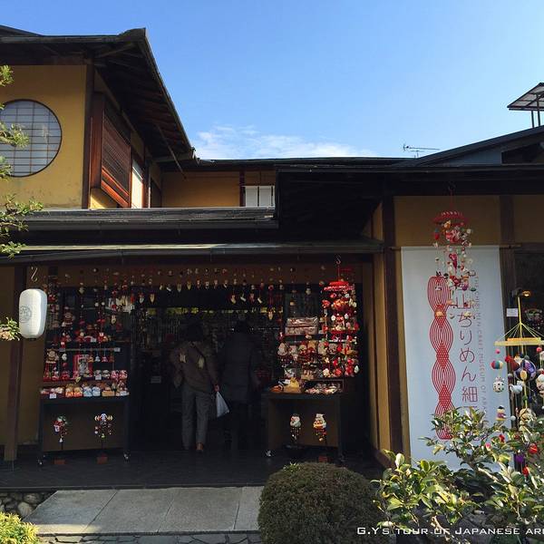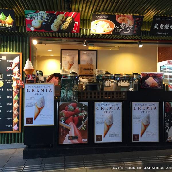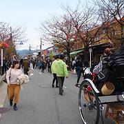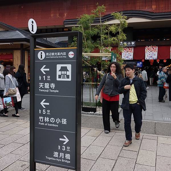感觉就是同样的店,同样的东西从二年坂搬了过来。街上也一样有人力车可以乘坐迅速的解决了午餐,我们便走过渡月桥,往天龙寺方向走去,不一会就看到了JR岚山站,这里人好多,街两边都是商店,卖的东西跟清水寺的二年坂、三年坂都差不多,很多都是连锁店。