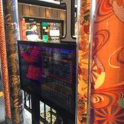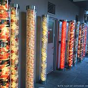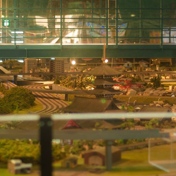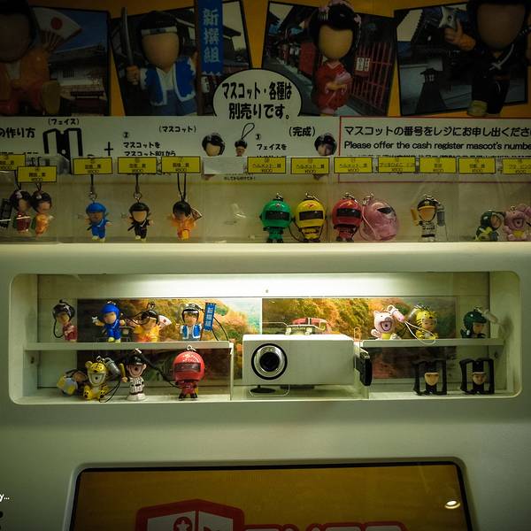 盛产吉祥物的国度,遍布萌死人爱不释手的玩偶,糖果,小器皿......比如这个小火车站,自己投币压纪念章,这一枚是我压的。拍大头贴做一个自己头像的人偶。各种小礼物柜台,这些都是常见的。最NB的是车站里这个京都铁路模型,门口有个小个的,屋里收费的似乎模拟了整个京都的电车交通。自己投币可以控制电车的行进,灯光。要是不要钱我能玩一天哦。