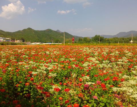 非常美丽的一个地方,周围村庄种植很多花卉,广场成了大花园,景观效果非常好,而且设施也都修建得很新,很漂亮,很有很农村的气象。农家乐、餐厅也很多,食宿都方便。