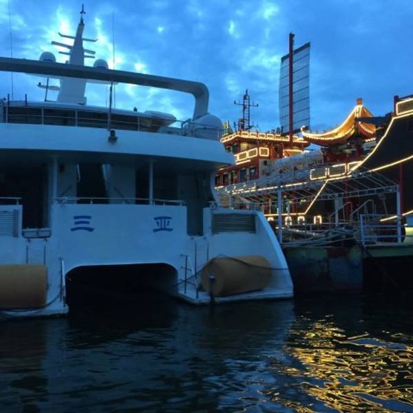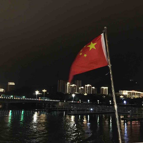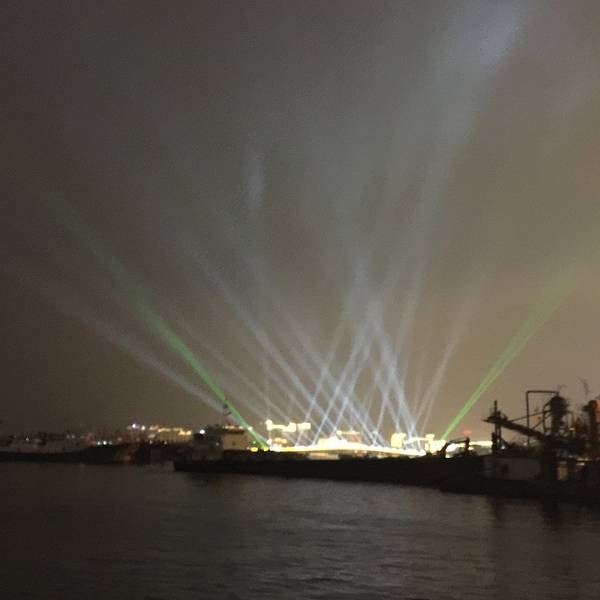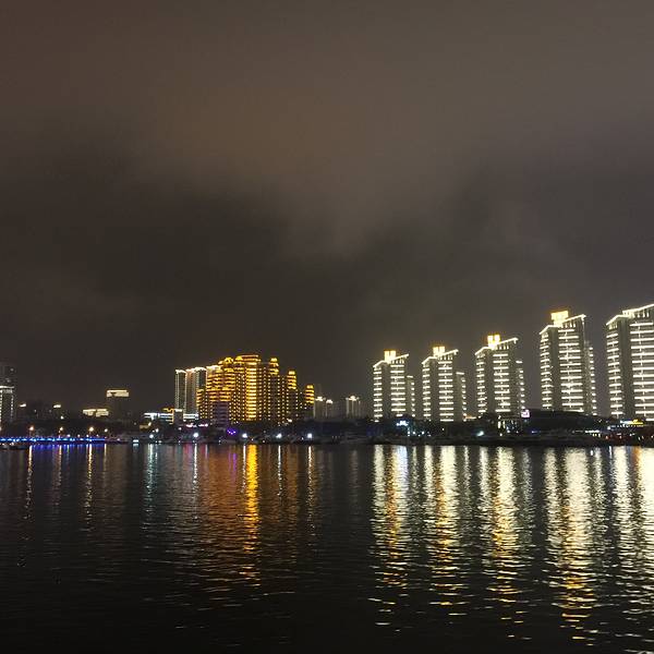 璀璨的灯火勾勒出城市的轮廓,闪烁的霓虹尽情泼泄着夜景的繁华。灯火倒影海中,波动着五光十色的炫彩。水中城、岸上城,已经浑然一片。
