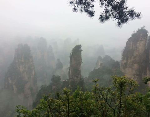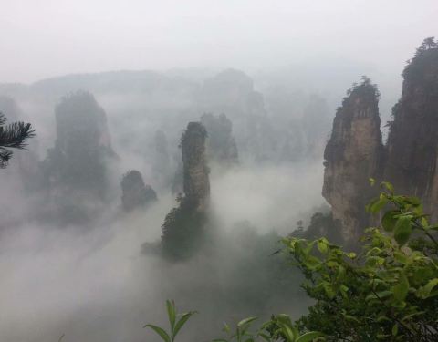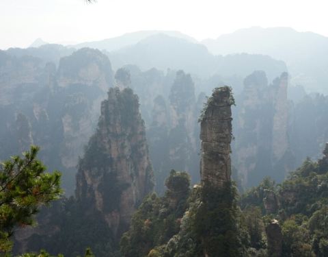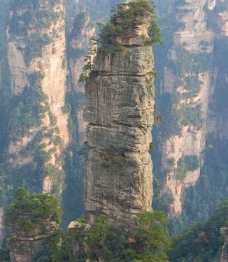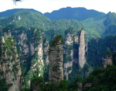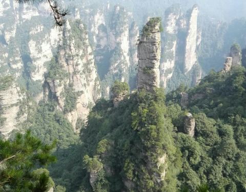 张家界的武陵源景区,没有经过任何的人工雕凿,到处是石柱石峰、断崖绝壁。玉瓶峰,高100多米,型如其名,像一只玉做的花瓶,置于绿树花丛之间。