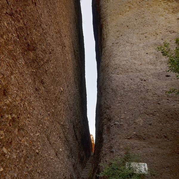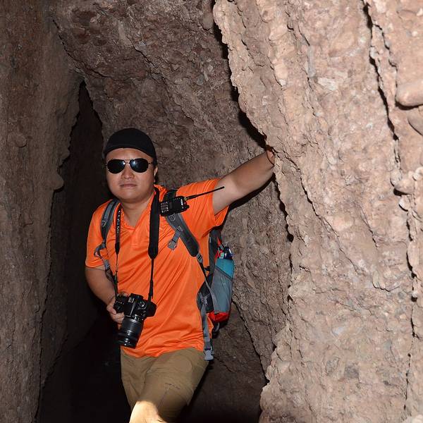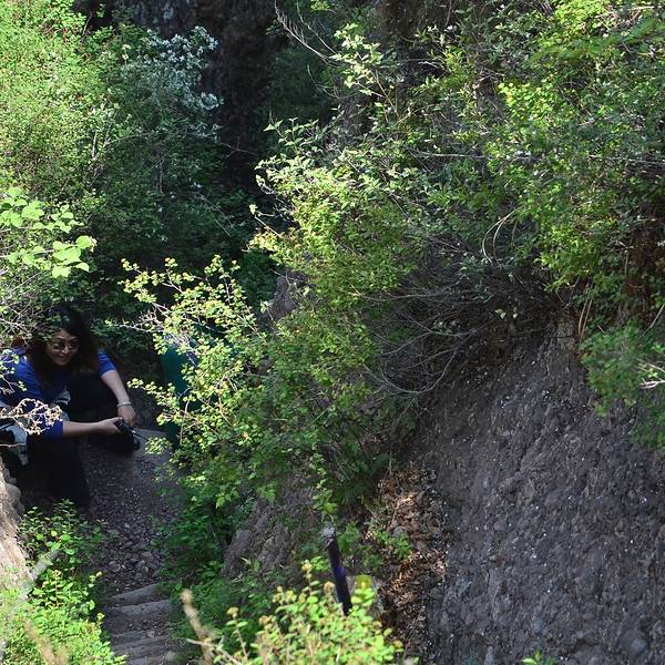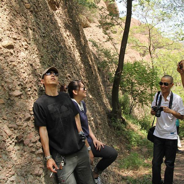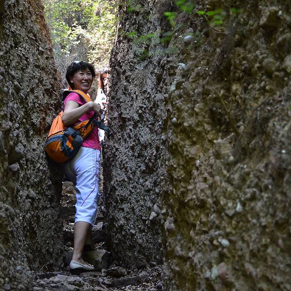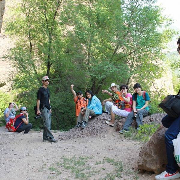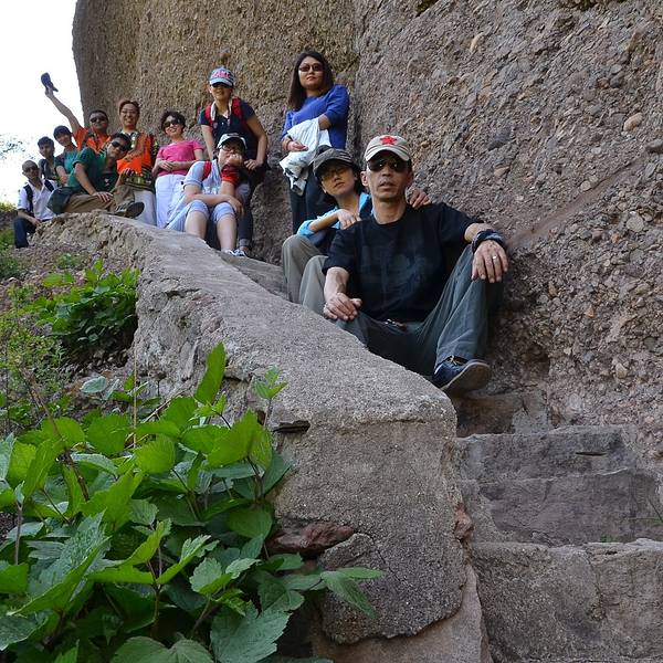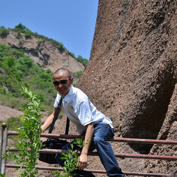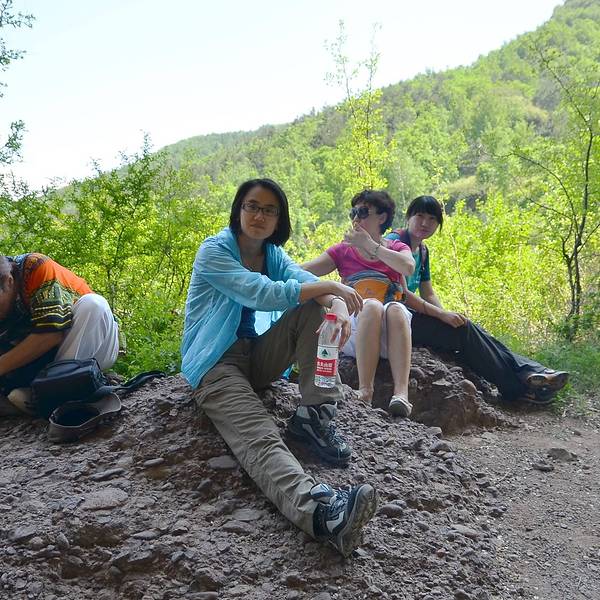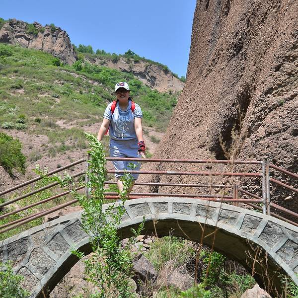 车子开进景区的那个铁栅栏门停好后,要先顺着这个台阶往上爬一小段,之后是二三百米的平地,这会儿就能看见吊桥了。我们查看了一下,除了在桥上拍照外,并没有越过桥,而是选择吊桥左侧的一条小路上山了,(那条路上有明显的上山台阶,像是主路)当天天气比较晒,五月底嘛,行走在山谷间的林荫处还是比较惬意的。路上男男女女的总是做各种搞怪,那会儿驴友”Tom要吃胖“还在北京工作,有他在很热闹,现在已经回张掖很多年了。一线天 这是我自己瞎起的名字啊,不过,我觉得很形象。我们在这个”一线天“里叠罗汉。不过要是从这个石缝里钻过去,不是每个人都那么容易的啊就这么一路走一路玩,过了很多栈道石缝,周围的石壁明显泛红,应该是丹霞地貌吧。到了山顶上的小亭子,原本要在这里野餐的,没想到空无一人的景区里,可能是那辆大巴上的驴友全都挤在那亭子里乘凉,一点空隙都没有。无奈我们只能前行再找个合适的纳凉处开搓吧。这地方虽然凉快,但是招虫子,不舒服!草草吃完午餐后下山的路上发现了更平整的地方。