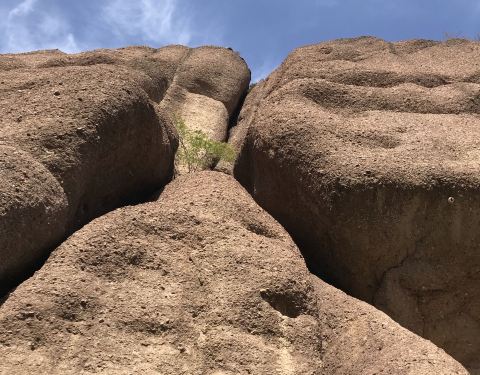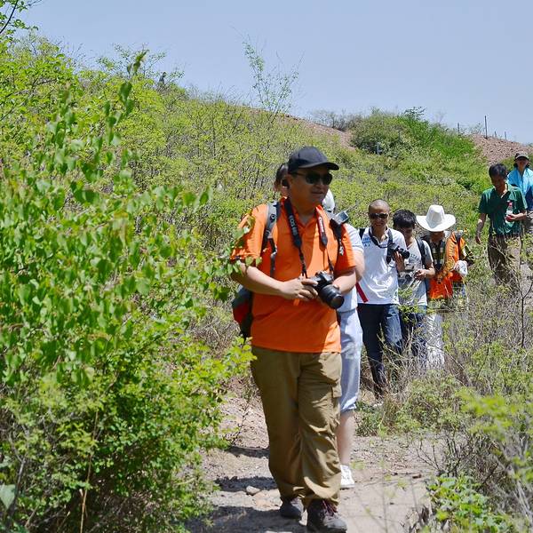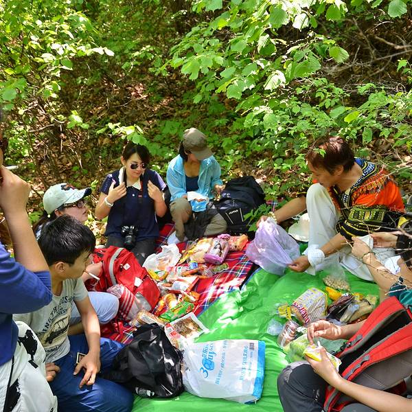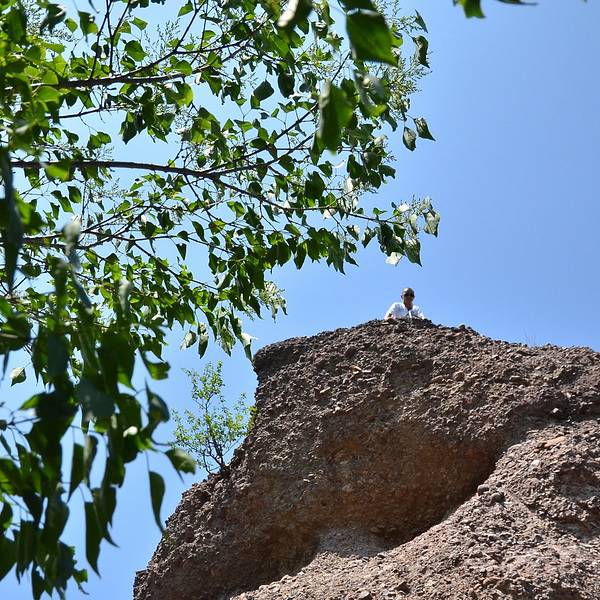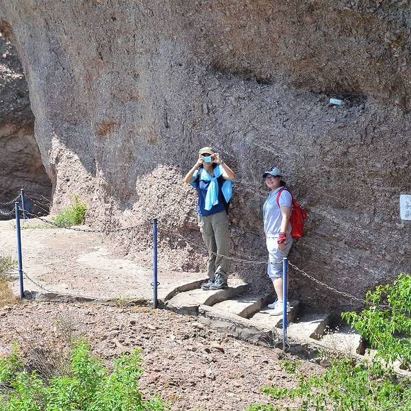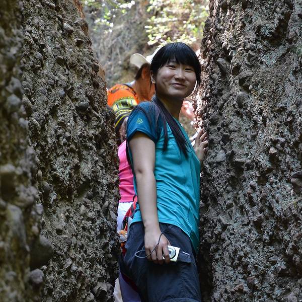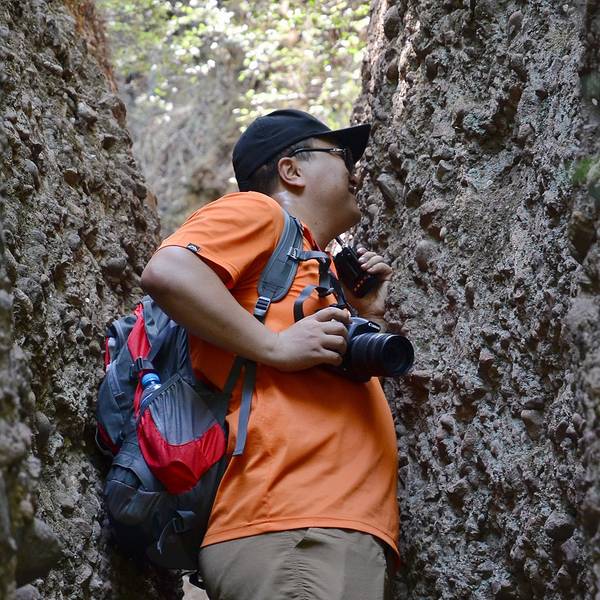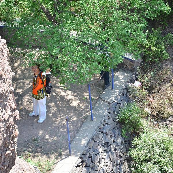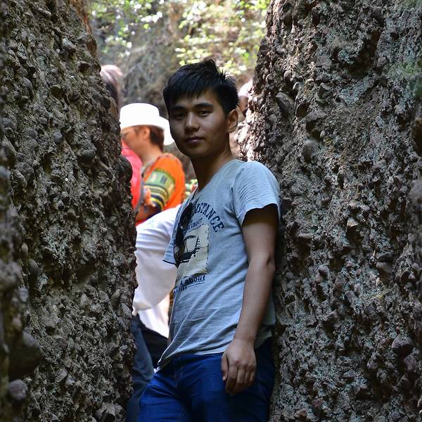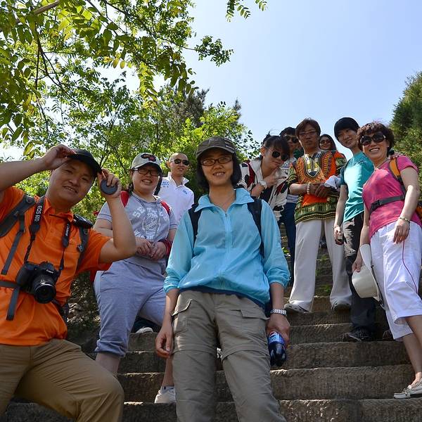 车子开进景区的那个铁栅栏门停好后,要先顺着这个台阶往上爬一小段,之后是二三百米的平地,这会儿就能看见吊桥了。我们查看了一下,除了在桥上拍照外,并没有越过桥,而是选择吊桥左侧的一条小路上山了,(那条路上有明显的上山台阶,像是主路)当天天气比较晒,五月底嘛,行走在山谷间的林荫处还是比较惬意的。路上男男女女的总是做各种搞怪,那会儿驴友”Tom要吃胖“还在北京工作,有他在很热闹,现在已经回张掖很多年了。一线天 这是我自己瞎起的名字啊,不过,我觉得很形象。我们在这个”一线天“里叠罗汉。不过要是从这个石缝里钻过去,不是每个人都那么容易的啊就这么一路走一路玩,过了很多栈道石缝,周围的石壁明显泛红,应该是丹霞地貌吧。到了山顶上的小亭子,原本要在这里野餐的,没想到空无一人的景区里,可能是那辆大巴上的驴友全都挤在那亭子里乘凉,一点空隙都没有。无奈我们只能前行再找个合适的纳凉处开搓吧。这地方虽然凉快,但是招虫子,不舒服!草草吃完午餐后下山的路上发现了更平整的地方。
