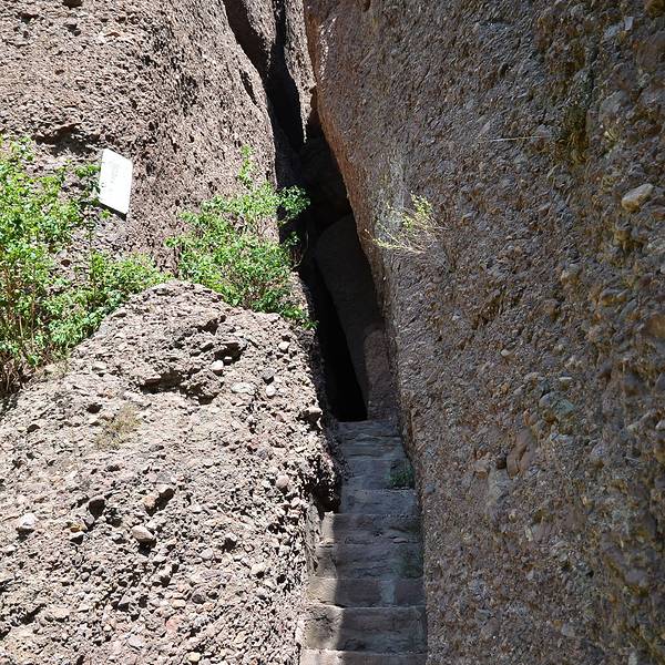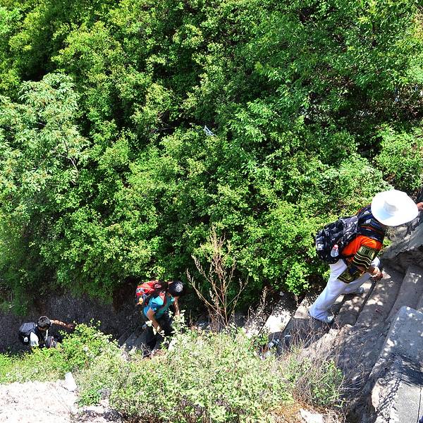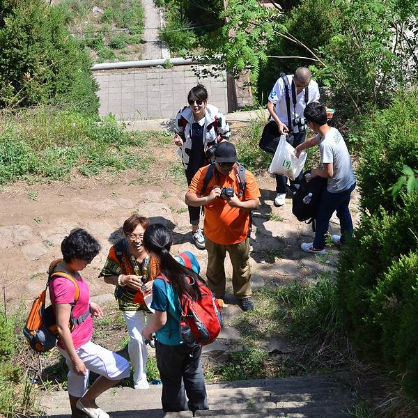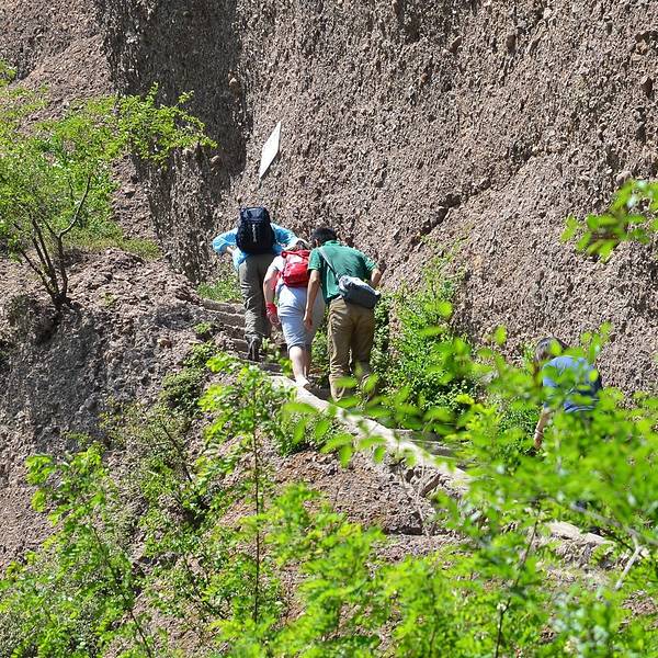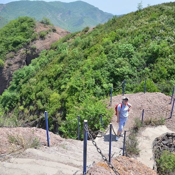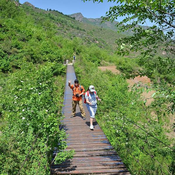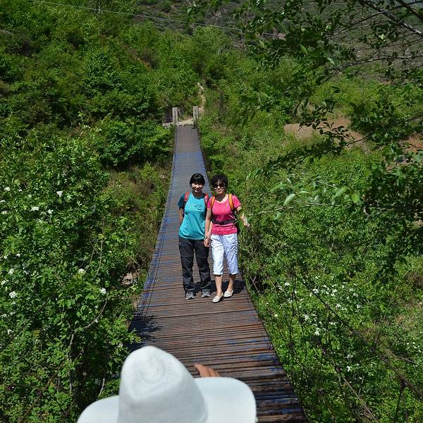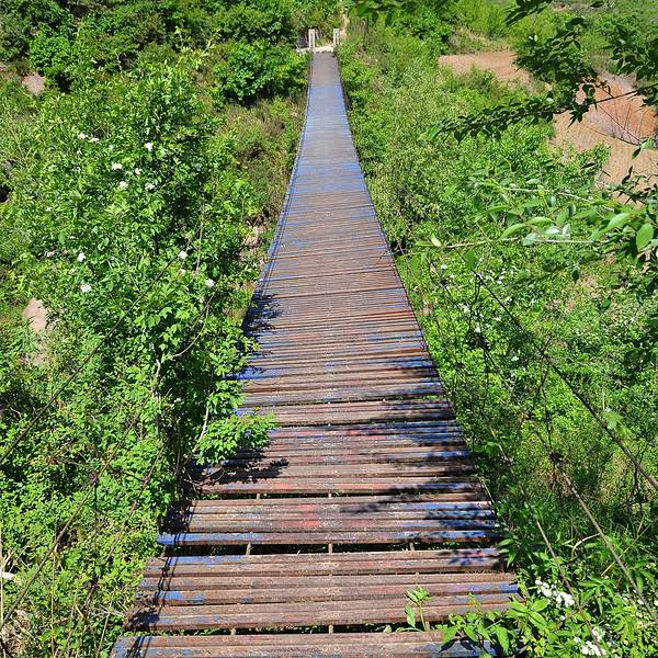 车子开进景区的那个铁栅栏门停好后,要先顺着这个台阶往上爬一小段,之后是二三百米的平地,这会儿就能看见吊桥了。我们查看了一下,除了在桥上拍照外,并没有越过桥,而是选择吊桥左侧的一条小路上山了,(那条...