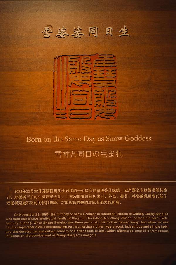 康熙秀才,雍正十年举人,乾隆元年(1736年)进士。官山东范县、潍县县令,政绩显著,后客居扬州,以卖画为生,为“扬州八怪”重要代表人物。在博物馆内有专门的一处关于郑板桥,还有他生前的一些不同的印章,