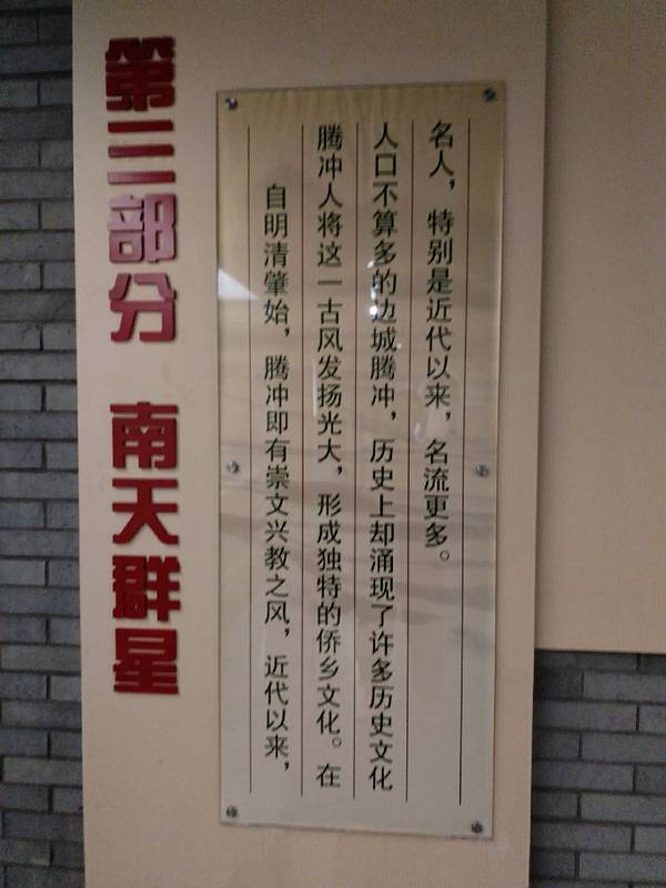 腾冲博物馆位于腾冲三桥文化广场后面,紧邻腾冲图书馆和腾冲群艺馆。总陈展面积2207平方米,由序厅、历史厅、非物质文化遗址厅、书画厅和临时展厅等5个展厅组成,展出文物(器物)760多件(套),图片310多张。博物馆值得看的是历史展厅和非物质文化遗址展厅。 历史展厅重新较为完整的介绍了腾冲城的发展。还有相对比较精彩的是关于腾冲近代马帮古道及翡翠贸易的展示,实物和图片结合完整的展示的腾冲近代繁荣的经济景象,回顾了腾冲的人们走夷方的场景。非物质文化遗产主要讲述的是腾冲碗窑的制陶技术、腾冲的界头的手工造纸技艺、及腾冲传统的翡翠加工、还有腾冲纸马等。 腾冲博物馆是地域历史民族文化传承的载体,也是国内外朋友了解腾冲历史文化的窗口。