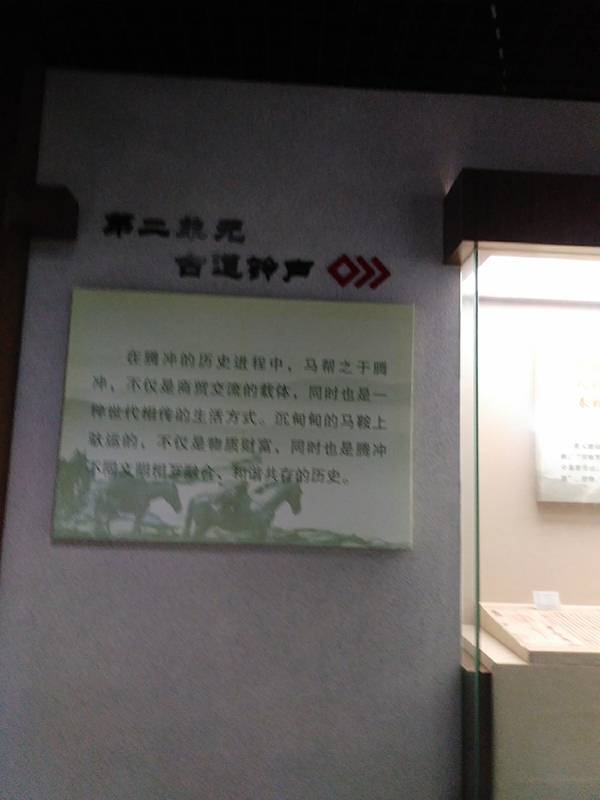 展览内容:以腾冲的历史沿革以及腾冲特产分别组成单元。腾冲自古是茶马古道的必经之地,因此这里有独特的茶文化,商贾文化。另外,还因与缅甸交界,因此这里也是翡翠玉石的贸易地。