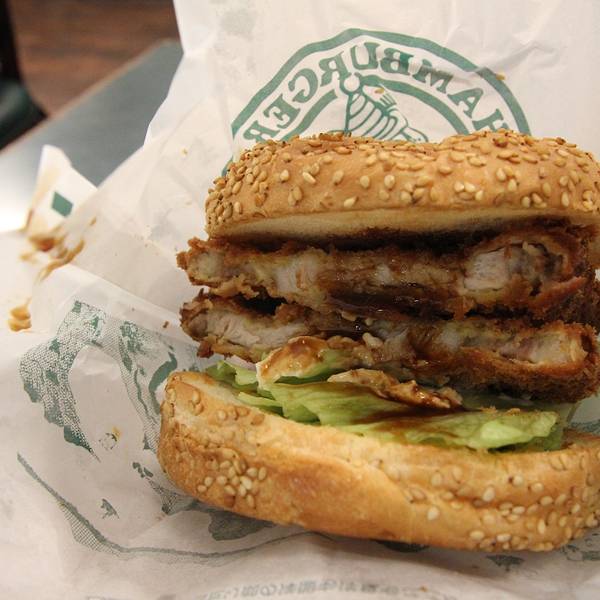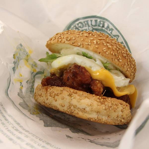 咖喱鸡肉饭,是大块的炸鸡,外焦里酥,口感不错。鸡肉汉堡包较之更大众化的肯德基/麦当劳,果然肉多了不少
