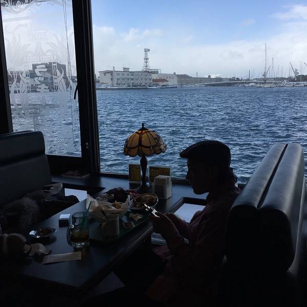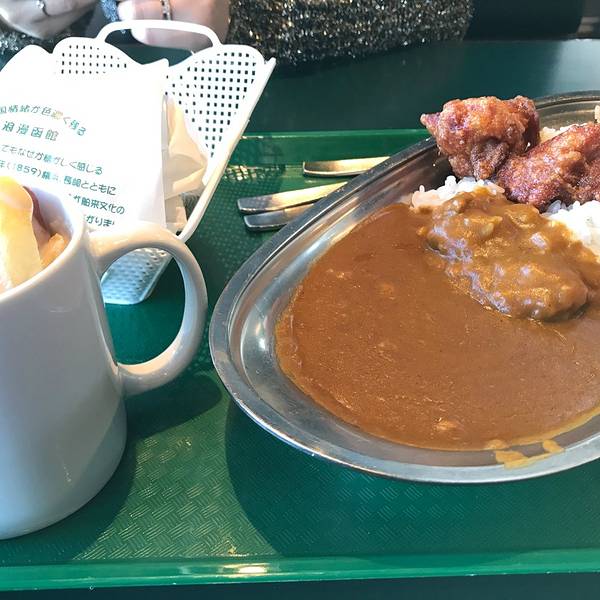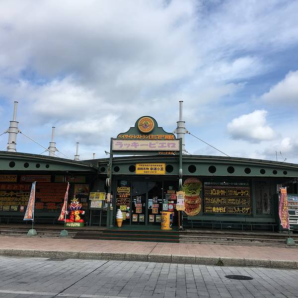 下面给爱吃快餐的同学们推荐一家好吃不贵的趣味餐厅,lucky pierrot hamburger小丑汉堡。走到这里是真的是没办法不进来看一看,进来看了一看就出不去了,一进去就有卖相关周边纪念品的,这么物美价廉的餐厅环境又好,里面人很多,我想抽烟所以就等吸烟区的位置,吸烟区的位置是挨着海的有海景可以看,非常惬意,坐下了就不可能不吃点什么,于是我就起身去点了一份咖喱炸鸡饭和一个汉堡,我俩也真的是太能吃了一天一直在吃。 点餐回来后,我家老孙和我说,你先别坐下,你看那边,我一看,又是那对日本情侣,大家都看着对方笑起来,看来我们的品味都差不多一路上都在挑一样的餐厅,一路上都在吃。很惊讶于一个快餐店能有这么好的环境,这样的餐厅要是开在国内生意肯定会特别特别好的!后来我们问了一下这个餐厅只有日本有。函馆我看见了两家这两家离得很近。