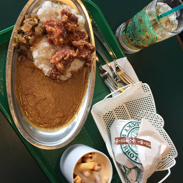 - 咖喱鸡肉饭,是大块的炸鸡,外焦里酥,口感不错。鸡肉汉堡包较之更大众化的肯德基/麦当劳,果然肉多了不少金骆驼