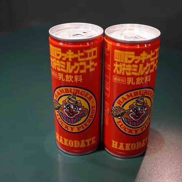 店里有小丑造型的乳酸饮料和可乐。