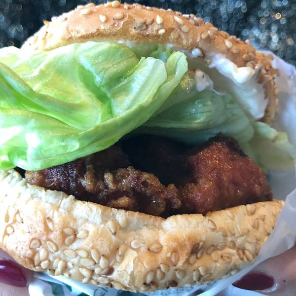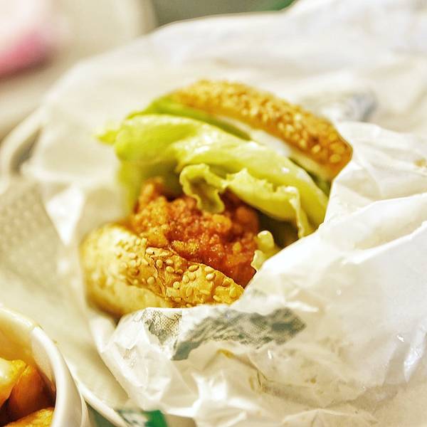 招牌是炸鸡汉堡。中式~我大天朝的炸鸡改良款。里面是大块的炸鸡块,肉质鲜嫩有汁水。汉堡胚被水蒸气浸的有一点点软掉了,整体来说口感还可以。