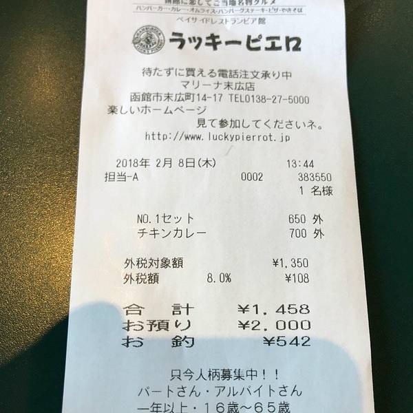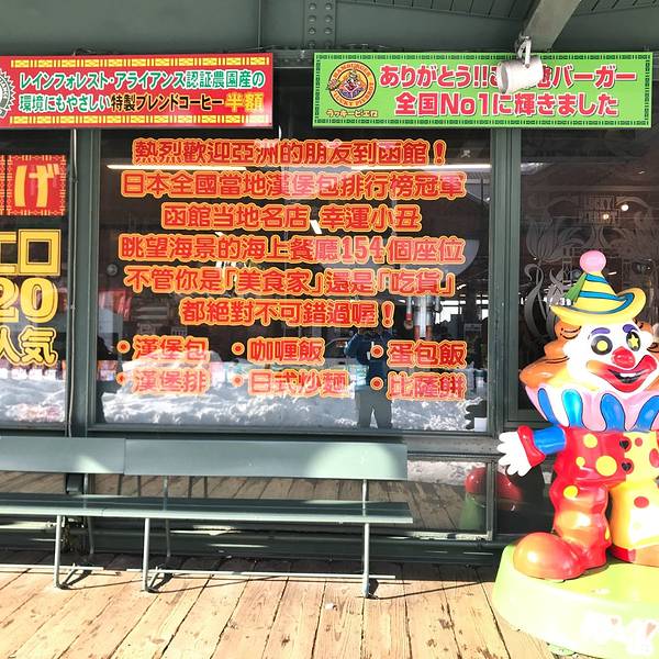 幸运小丑汉堡,是函馆地区特有的一家连锁型汉堡店,同时也是风靡于各大攻略网站的一家网红店,这里以销售牛乳冰淇淋和多肉的汉堡被众多网友津津乐道。我所介绍的这家店,是来参观金森仓库群时无意间看到的,正好...幸运小丑汉堡,是函馆地区特有的一家连锁型汉堡店,同时也是风靡于各大攻略网站的一家网红店,这里以销售牛乳冰淇淋和多肉的汉堡被众多网友津津乐道。我所介绍的这家店,是来参观金森仓库群时无意间看到的,正好肚皮饥肠辘辘,加上外面大雪纷飞,便不自觉的走了进来。这家店位于函馆著名的景点金森仓库群,JR从函馆站乘坐2路或者5路电车,在十字街小车后大约步行500米左右即可抵达。由于店铺位于金森仓库群的正对面,给我的第一感觉,是位于景点的一家餐厅,而且还是黄金地段。店隔壁还有星巴克,日式餐厅等其他餐厅。店门口有标志性的“幸运小丑”的卡通塑像,坐在旁边的椅子上刚好可以跟“幸运小丑”来张合影。巨型汉堡包和幸运公仔的卡通塑像,是这家店的两个名片,也是一般游客最喜欢的合影对象,因此一般都会被放置在店门口。照片墙上,是幸运小丑汉堡店在函馆地区的16家分店名称和外观,受欢迎程度可见一斑。店铺分布照片墙前面的心形合影区,也是情侣们喜欢合影的地方之一。这样一张充满卡通版的身高尺,是很多小盆友的最爱。宝宝,今天又长高了么?餐厅分为里外间,共有154个座位。其中里间是无烟区,这里分布了100个座位,外间则为吸烟区,有54个座位供客人使用。餐厅介绍中,全部154个座位均号称是海景座位,其实只有靠近外侧的54个座位,是真正可以看到海景的。大门左侧,是一个销售函馆特产的小店铺,这里很是食品都会标注“北海道限定”或者“函馆限定”,在其他地方是不容易买到的。前台收银台分为左右两部分,其中购买特产的在左边排队结账,而前台点餐的客人则需要在右侧通到排队。这里的餐品以汉堡、披萨、咖喱饭、海鲜面为主。我们点了餐厅推荐的汉堡套餐和咖喱鸡肉饭,合计1350日元,另外还需包含8%的税。其中汉堡套餐650日元,包含一个鸡肉汉堡,一份芝士薯条和一杯冰绿茶,咖喱鸡肉饭则700日元,咖喱味很正。点餐后,会拿到一个带有数字的等餐牌,然后自助找座位坐下,餐食准备好之后,工作人员会根据餐牌送餐到座位跟前。餐厅卫生间,位于中部通道的右侧,比较醒目。我们选择了更靠近海景的外侧吸烟座位区,共有54席。靠近玻璃落地窗座位,可以直观到海景。这里是一个长条形的通道,墙壁上挂有许多北海道地区风景油画。外侧还有一台净水饮水机,机器还具备加冰等其他功能。机器旁边有透明的塑料杯自助使用,饮水免费。大概等了有10分钟,餐就送上来了。芝士薯条是放在杯子里的,芝士味道很足,薯条脆而不干。鸡肉汉堡包较之更大众化的肯德基/麦当劳,果然肉多了不少。咖喱鸡肉饭,是大块的炸鸡,外焦里酥,口感不错。由于毗邻码头,窗外的海景一般,时不时有一些轮船经过,视野不是特别的好。用餐之后,需要把餐具送至回收区,交给工作人员后方可离开。