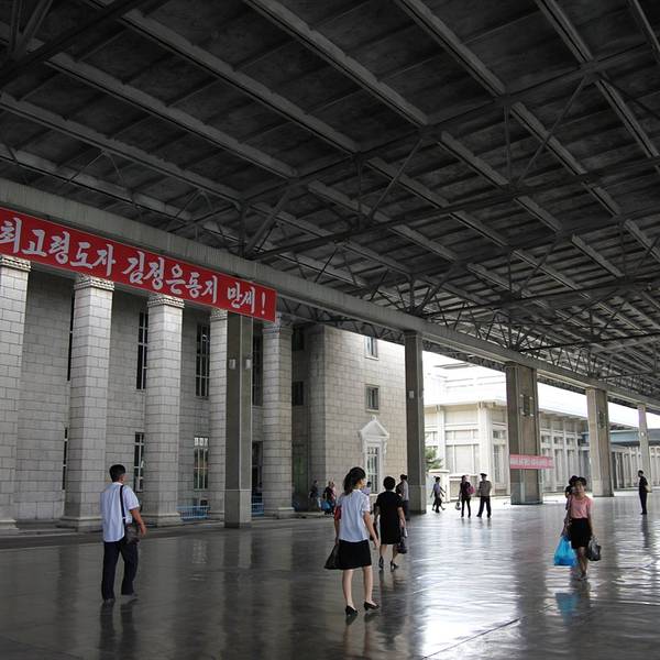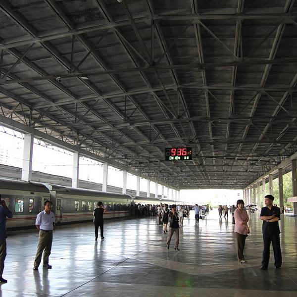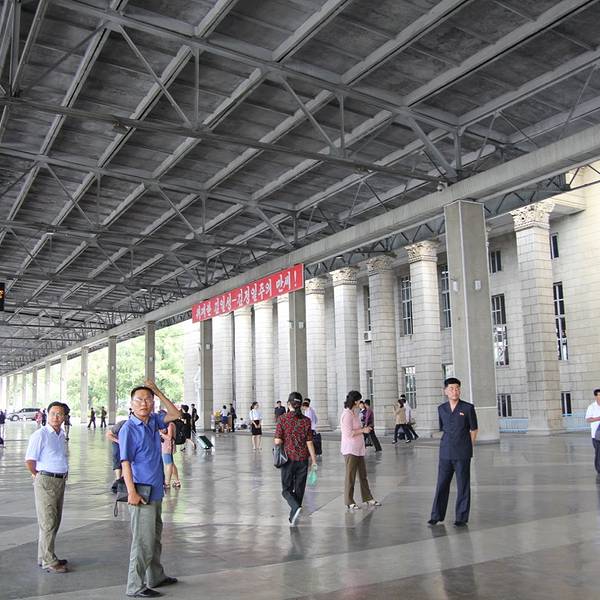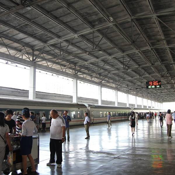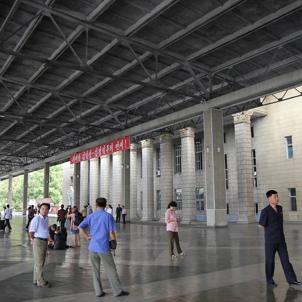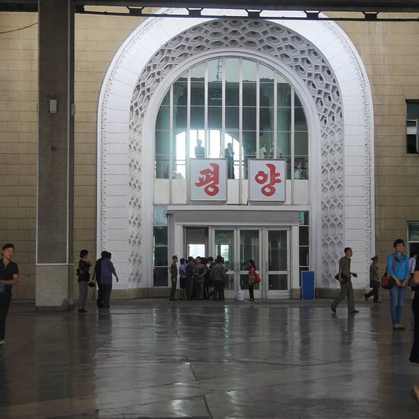 平壤火车站位于首都平壤市的繁华地带。我们从丹东上火车,乘坐北京到平壤的火车抵达平壤。平壤火车站外观古朴,风格简约。站前广场面积不大,有很多市民在看广场上的大屏幕播放的战争片。和平壤地铁相比,平壤火...平壤火车站位于首都平壤市的繁华地带。我们从丹东上火车,乘坐北京到平壤的火车抵达平壤。平壤火车站外观古朴,风格简约。站前广场面积不大,有很多市民在看广场上的大屏幕播放的战争片。和平壤地铁相比,平壤火车站人流络绎不绝。朝鲜人民非常热情,接送游客都是两个导游。可见两国人民的鱼水深情。