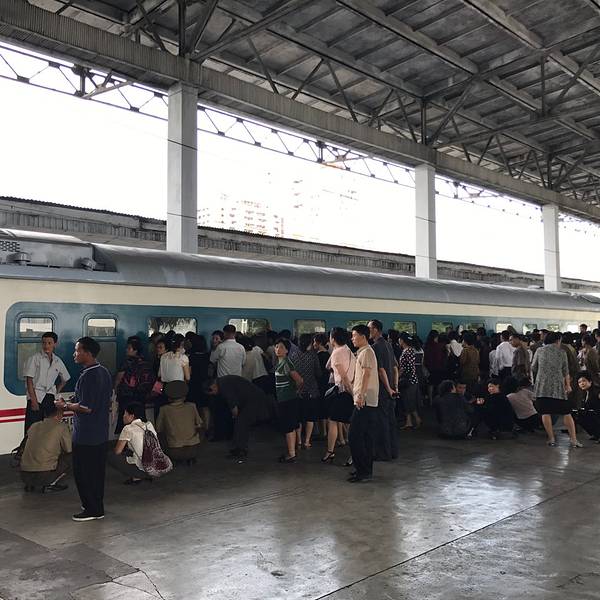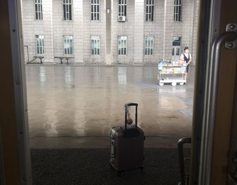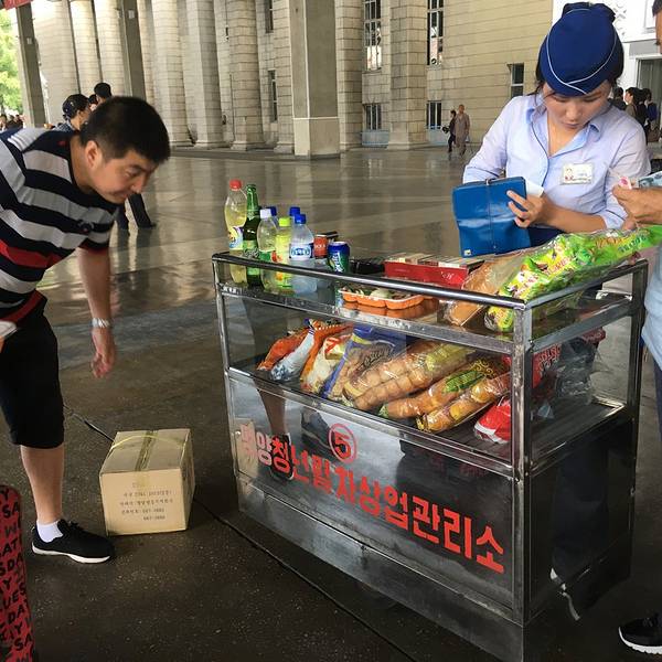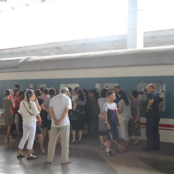 平壤火车站和一般的火车站一样车水马龙跟着导游和大家一起从一个小门进站,就特别的随意火车已经进站,大家可以陆续的上车,车要10:10分才发车。大家抓紧时间在小推车上看看还有什么要买的上车后看到有人下车拍照...
