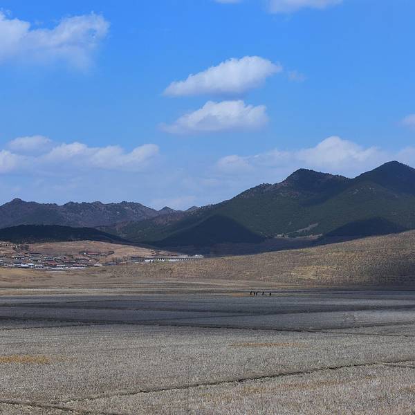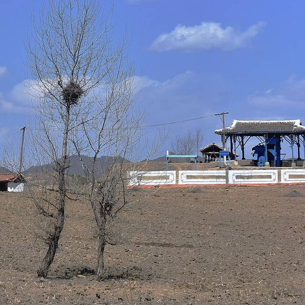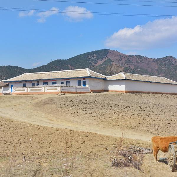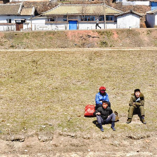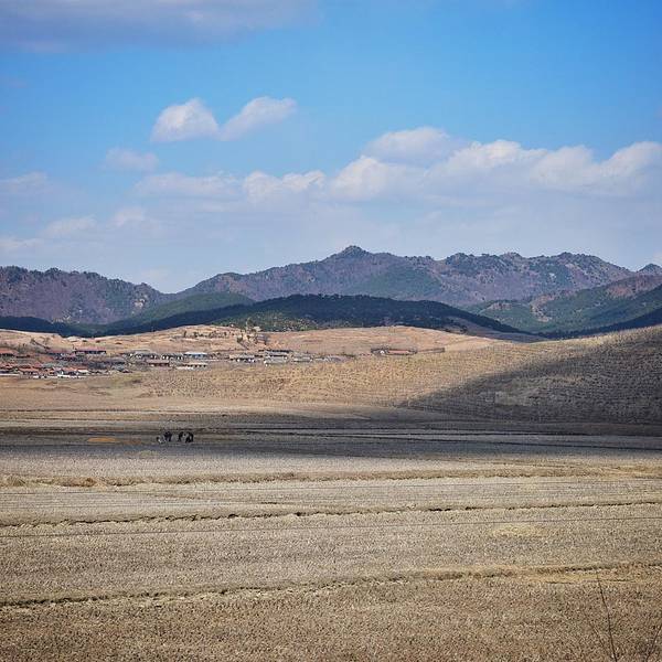 几乎是饿着肚子离开酒店的,最后一顿早餐安排在酒店的顶层,是个旋转餐厅,我去的不算太晚还在早餐时间范围内,但是餐厅已经基本没有吃的东西了,连稀饭都没有了,就剩一点蔬菜和两块鱼,就这样饿着肚子匆忙离开酒店,在一个物质严重匮乏的国度,尽管我们每天开心地吃着每天他们努力提供的不一样的伙食,但我们还是能明显感受到他们的努力和因匮乏导致的无奈。很心酸,更希望他们自己先吃饱吃好再来努力给外人展示。从 朝鲜 回来后我比以前更懂得珍惜和节俭大家凑合着看吧,我基本是站在一个位置朝着各个方向摁一张,没有时间也不敢多走动。这里给个小贴士:如果你选择火车的话,尽量到最后一节车厢,因为可以看到这样的画面,有没有觉得很美,拿个脚架拍个延时都是超美的哦。仅仅四天时天,田野开始发绿,蓝天白云下的这片农田已露生机。大片的农田和时不时会出现的延绵的丘陵在大自然光影的点缀下,显得异常的漂亮,很像我国云贵川地区,来到 朝鲜 导游一直不让我们拍农村、农民,他们觉得农村比较破旧,农民因为要干农活的关系身上比较脏,所以不让我们拍了带出去,那种强烈示好的心态真累啊。这张是原图,没有二次构图,这几个人坐的离火车很近。