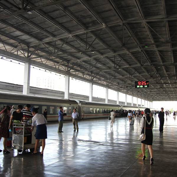 第一天抵达平壤时,是晚上,灯光映照下,整个火车站,尤其是站外广场上,都是橙黄色的,跟想象中的完全不一样。最后一天离开是上午,看的更真切些,火车站面积不大,车次不多,见到的国人居多。